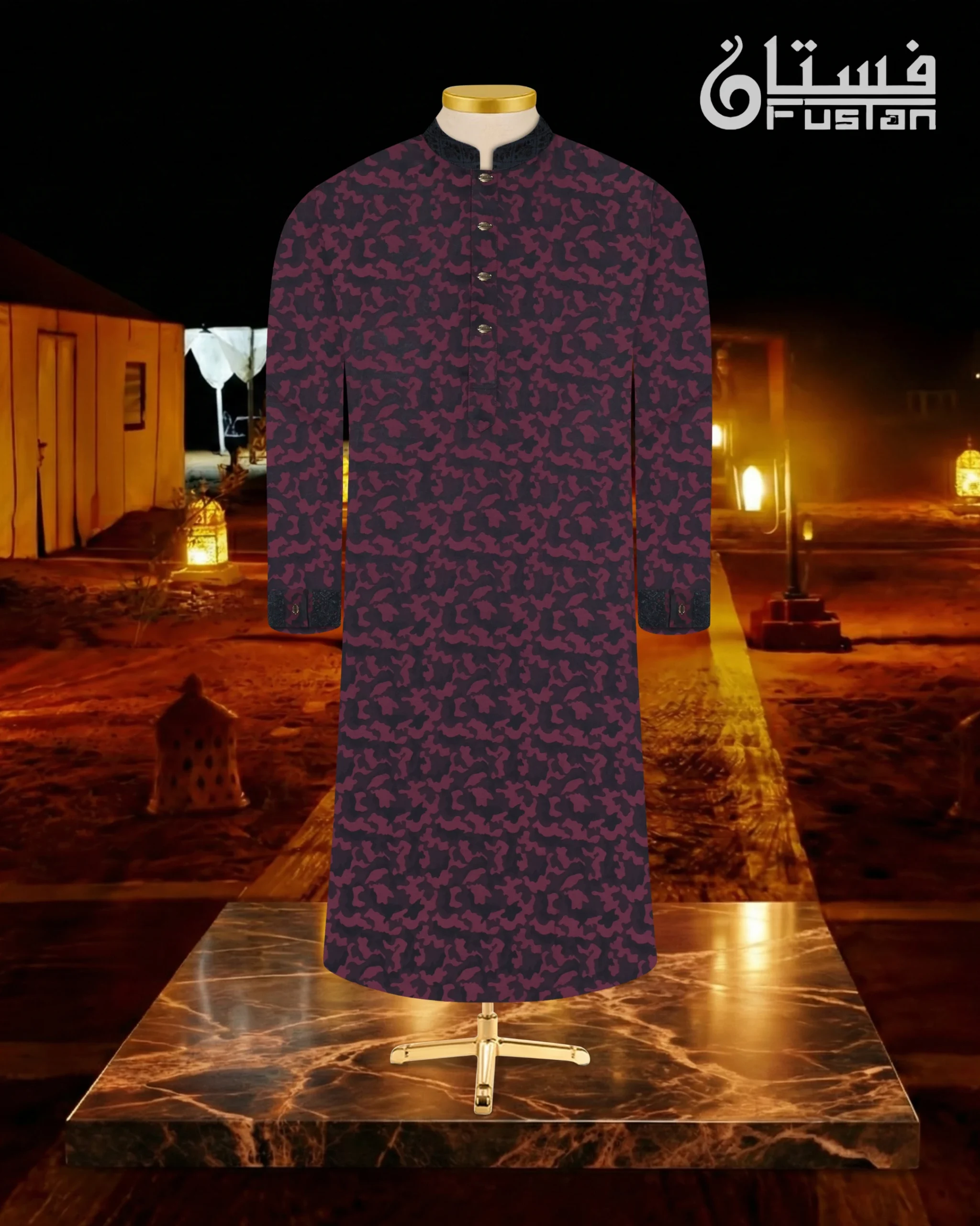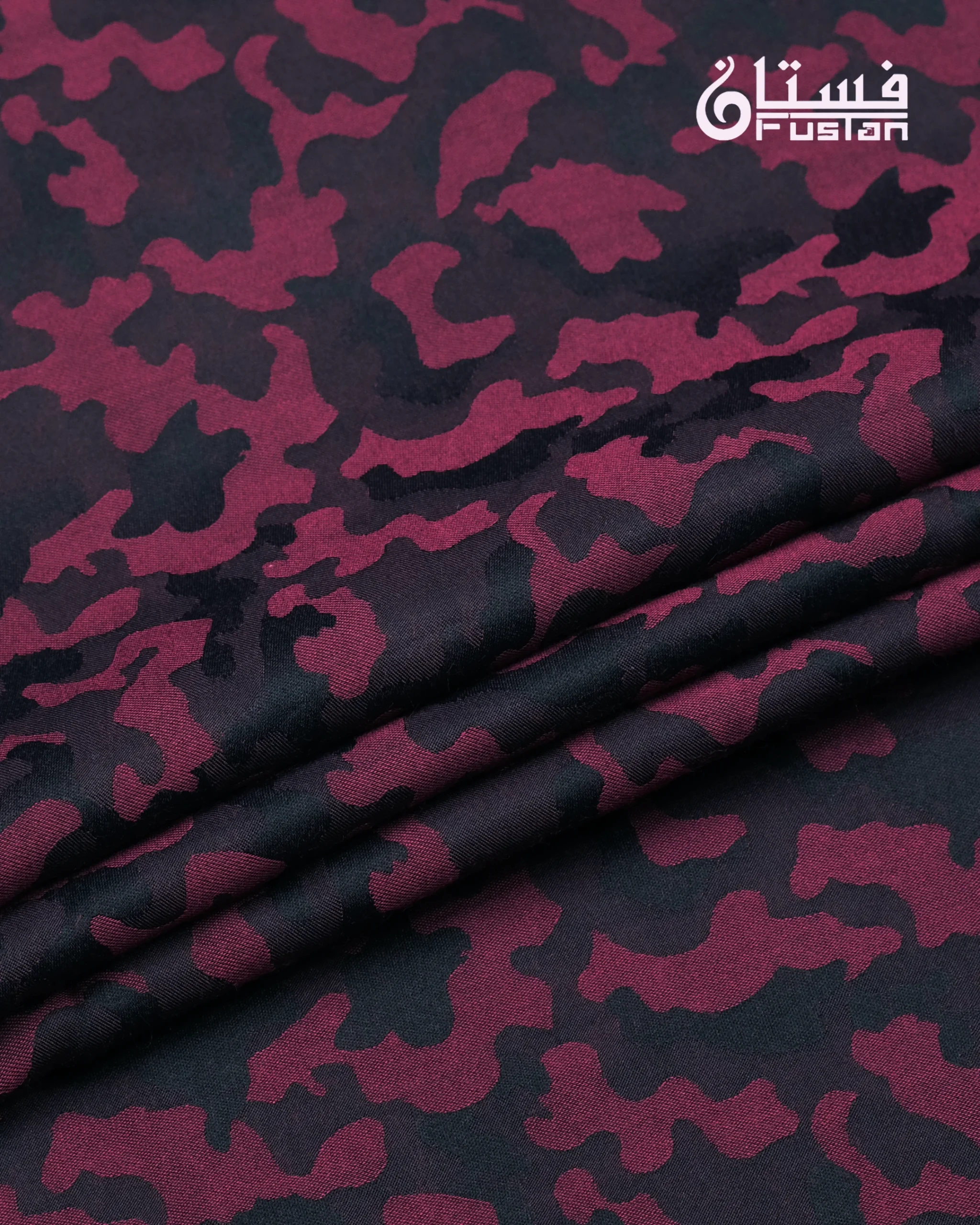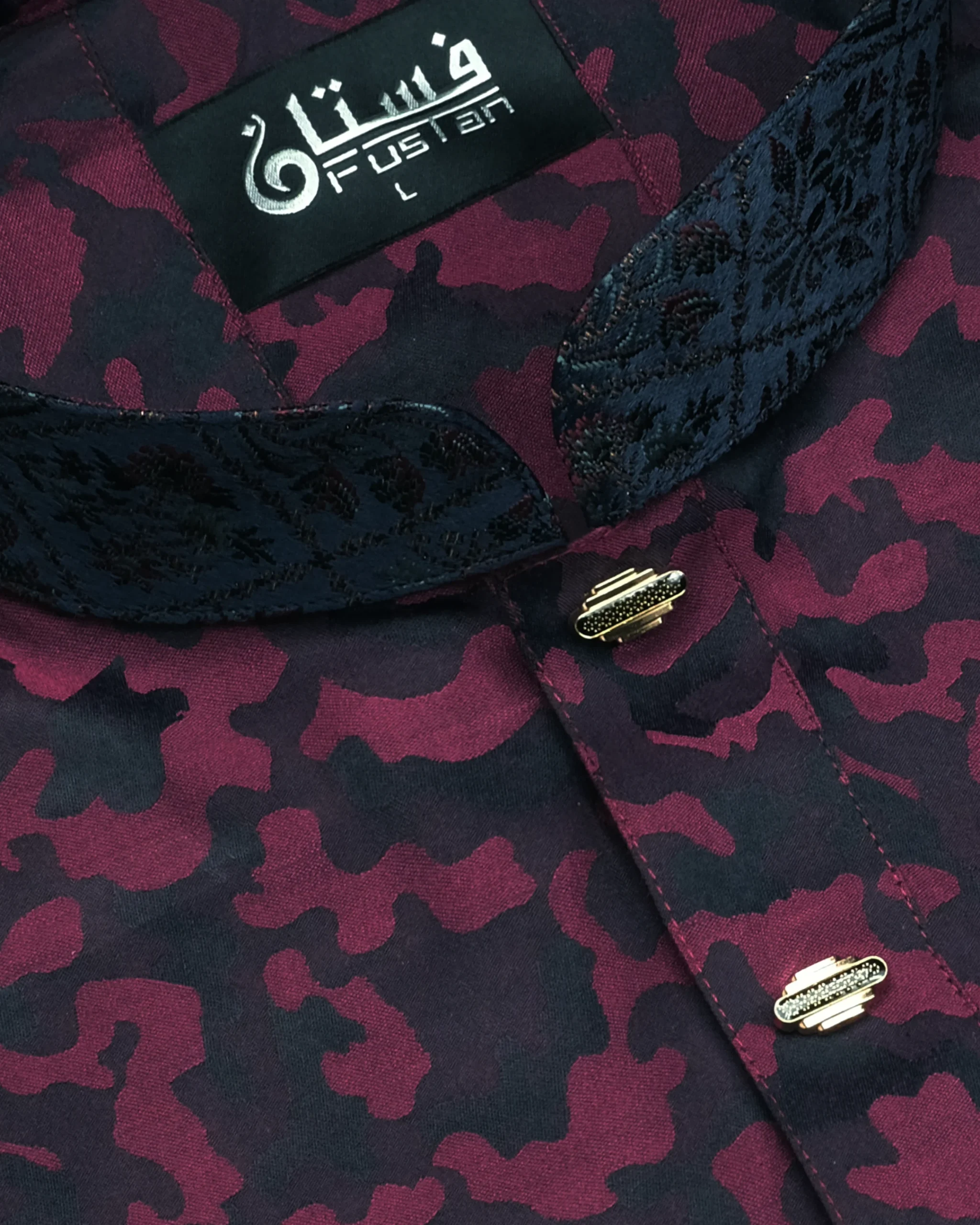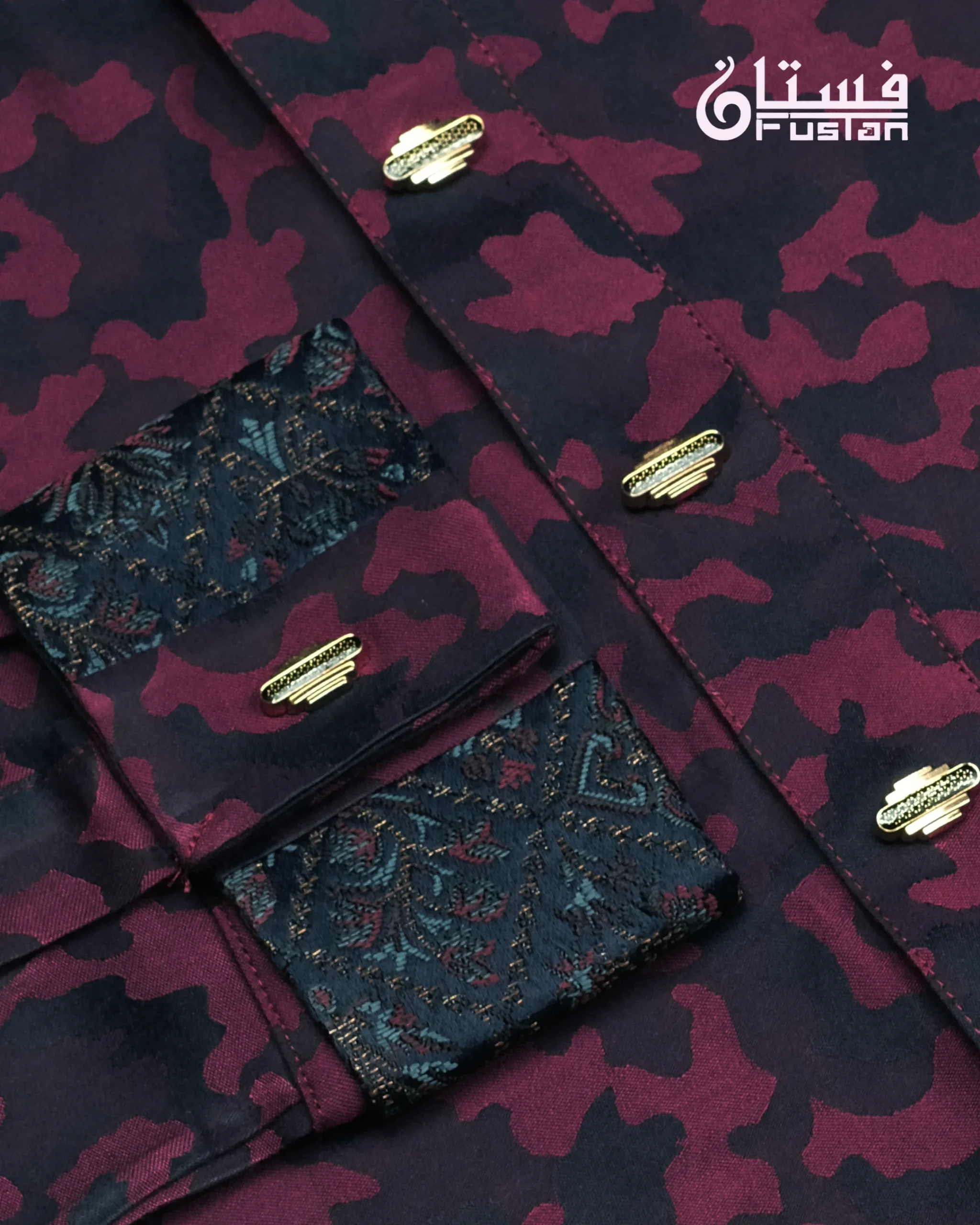 Exude a bold and contemporary charm with this masterfully crafted Panjabi from Fustan. This garment is set against a vibrant Magenta base featuring a unique all-over camouflage-inspired tonal texture, offering a sharp and authoritative silhouette. The design is further elevated by contrasting deep charcoal patterned accents on the mandarin collar and sleeve cuffs, providing a sophisticated visual break. Finished with exclusive horizontal-shaped metal snap buttons with a shimmering textured center and golden-toned frame, this piece is designed for the modern man who values artisanal excellence and a daring color palette.