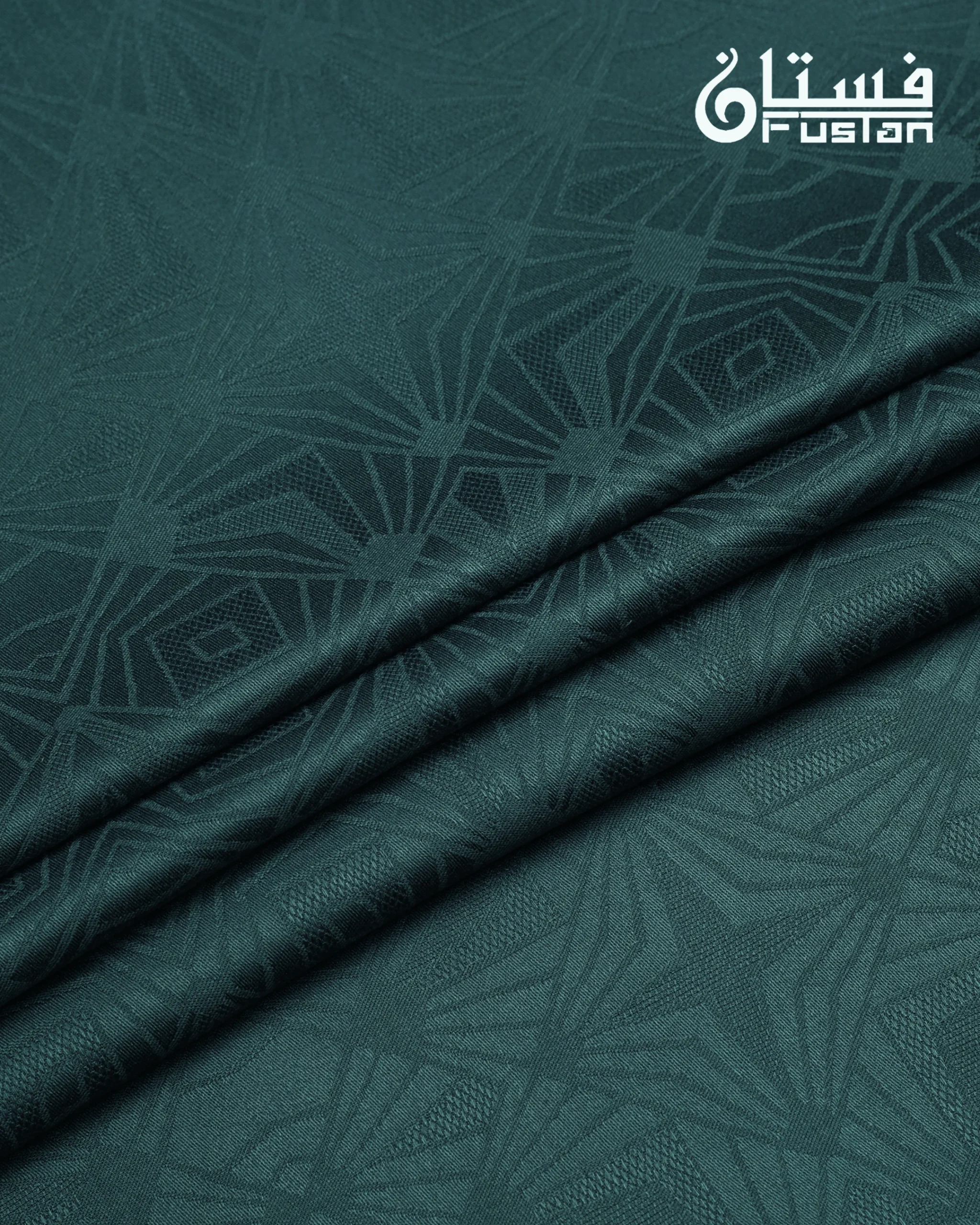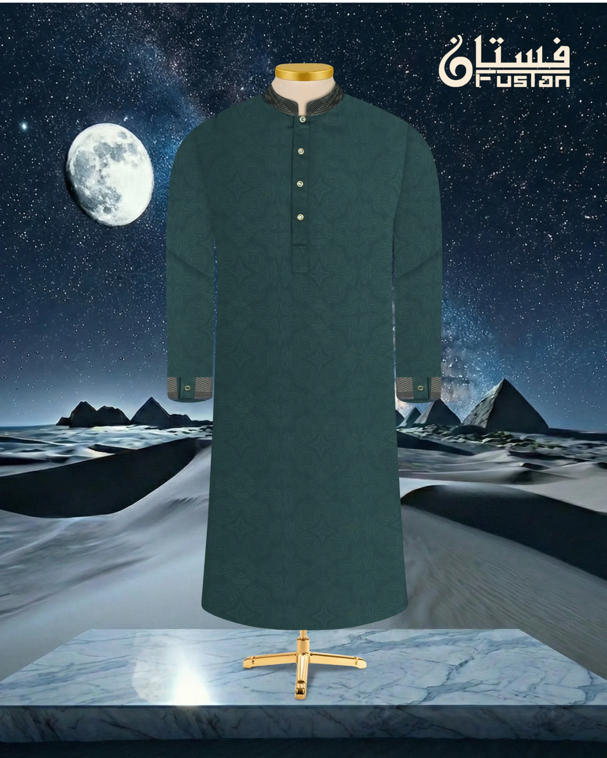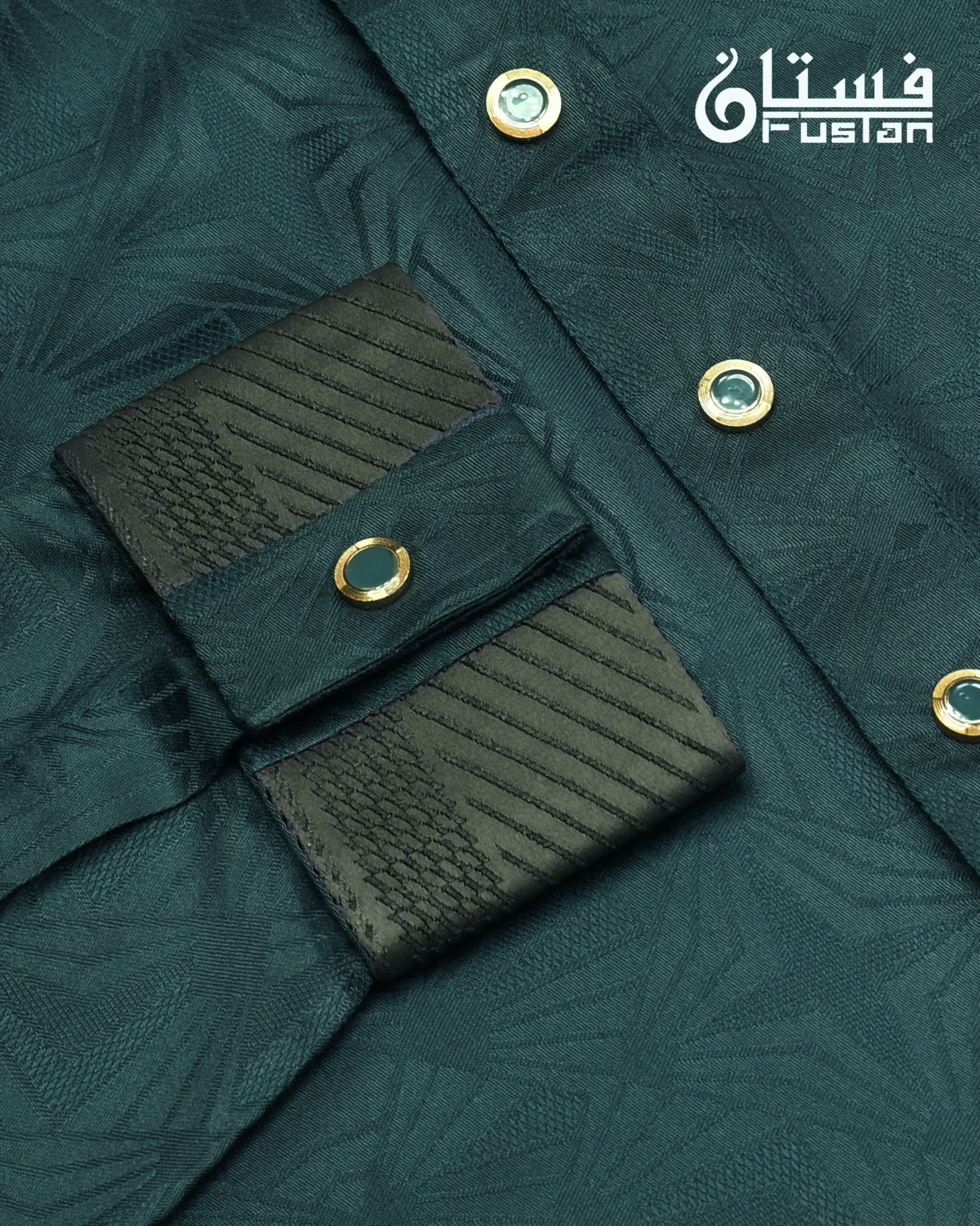 Command attention with the deep, jewel-toned elegance of this masterfully crafted Designer Panjabi from FUSTAN. Set against a rich Emerald Green base, this garment features an intricate, all-over starburst geometric jacquard texture that creates a dynamic play of light and shadow. The design is elevated by contrasting midnight-grey jacquard accents on the mandarin collar and sleeve cuffs, featuring a sharp linear embossed pattern for a modern edge. Finished with exclusive circular metal snap buttons with a shimmering emerald-toned inlay and golden frame, this piece is designed for the man who values artisanal complexity and a powerful, regal aesthetic.