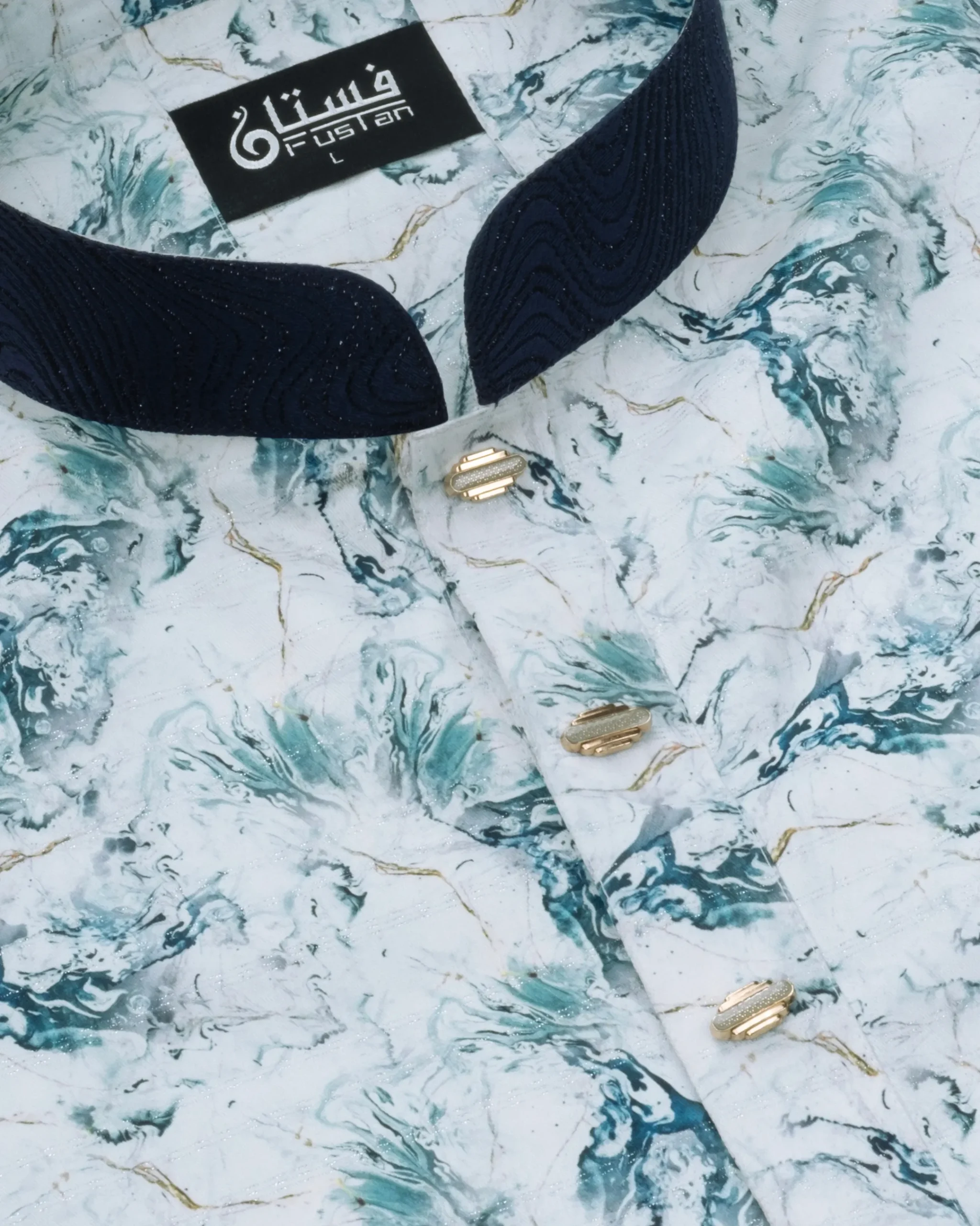 Elevate your presence with this masterpiece of craftsmanship from Fustan. This Panjabi is set against a premium white base featuring a sophisticated Green Marble Print, offering a modern and sharp silhouette. The highlight is the unique Contrast Design featuring a deep emerald green textured collar and matching sleeve cuffs for a bold contemporary look. Finished with exclusive gold-toned ornamental buttons, this piece is designed for the man who seeks a fresh, artistic, and impeccable look for grand occasions.