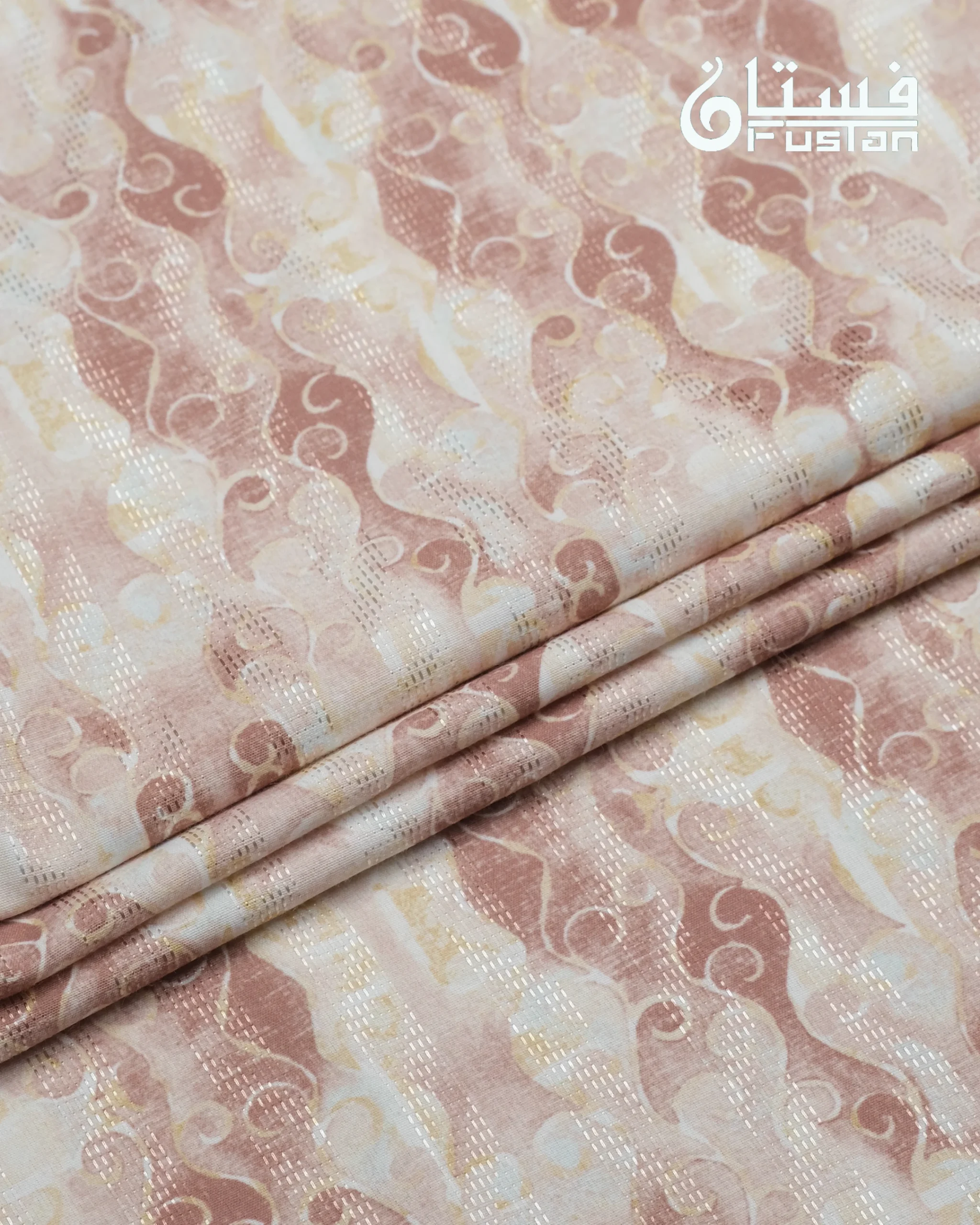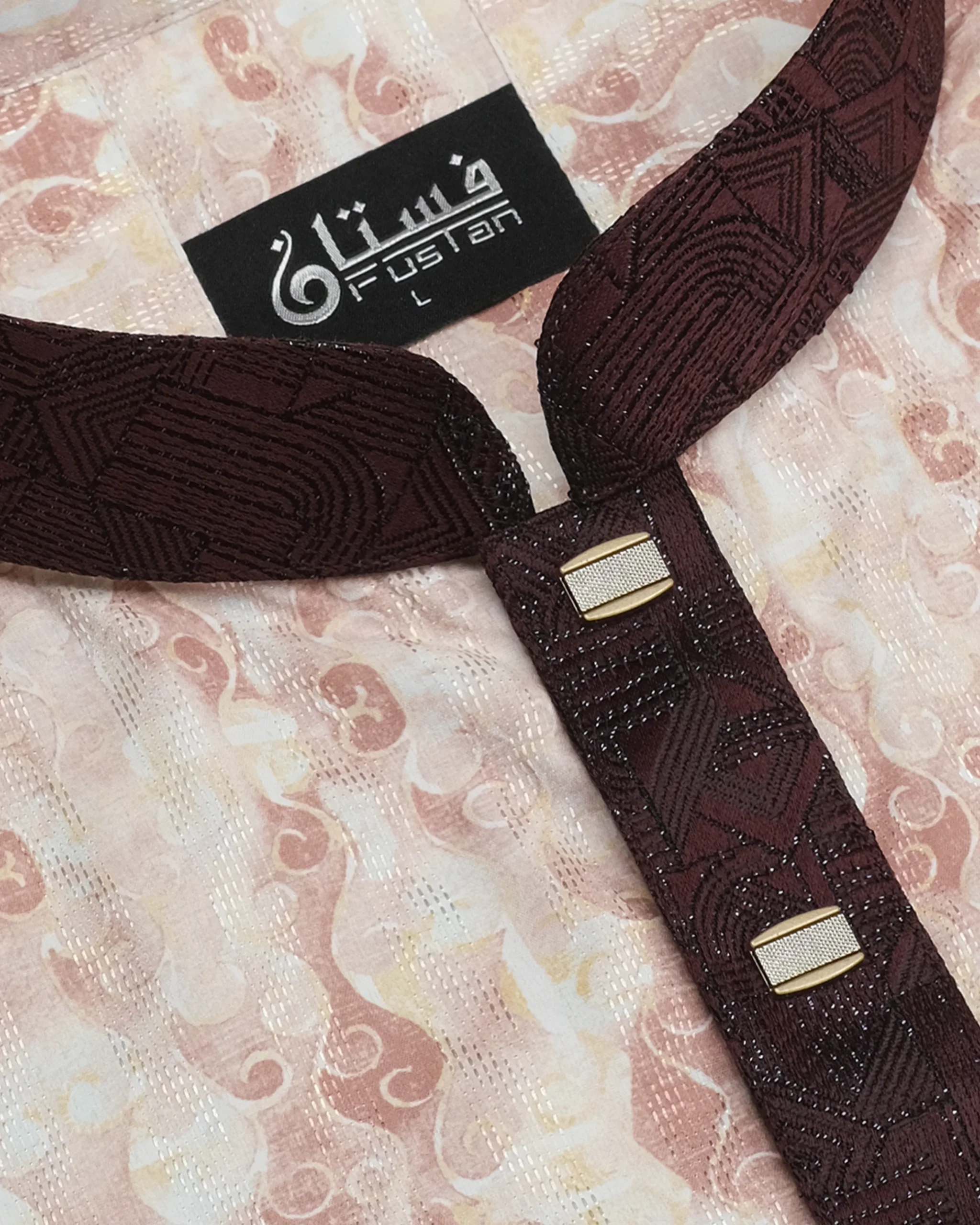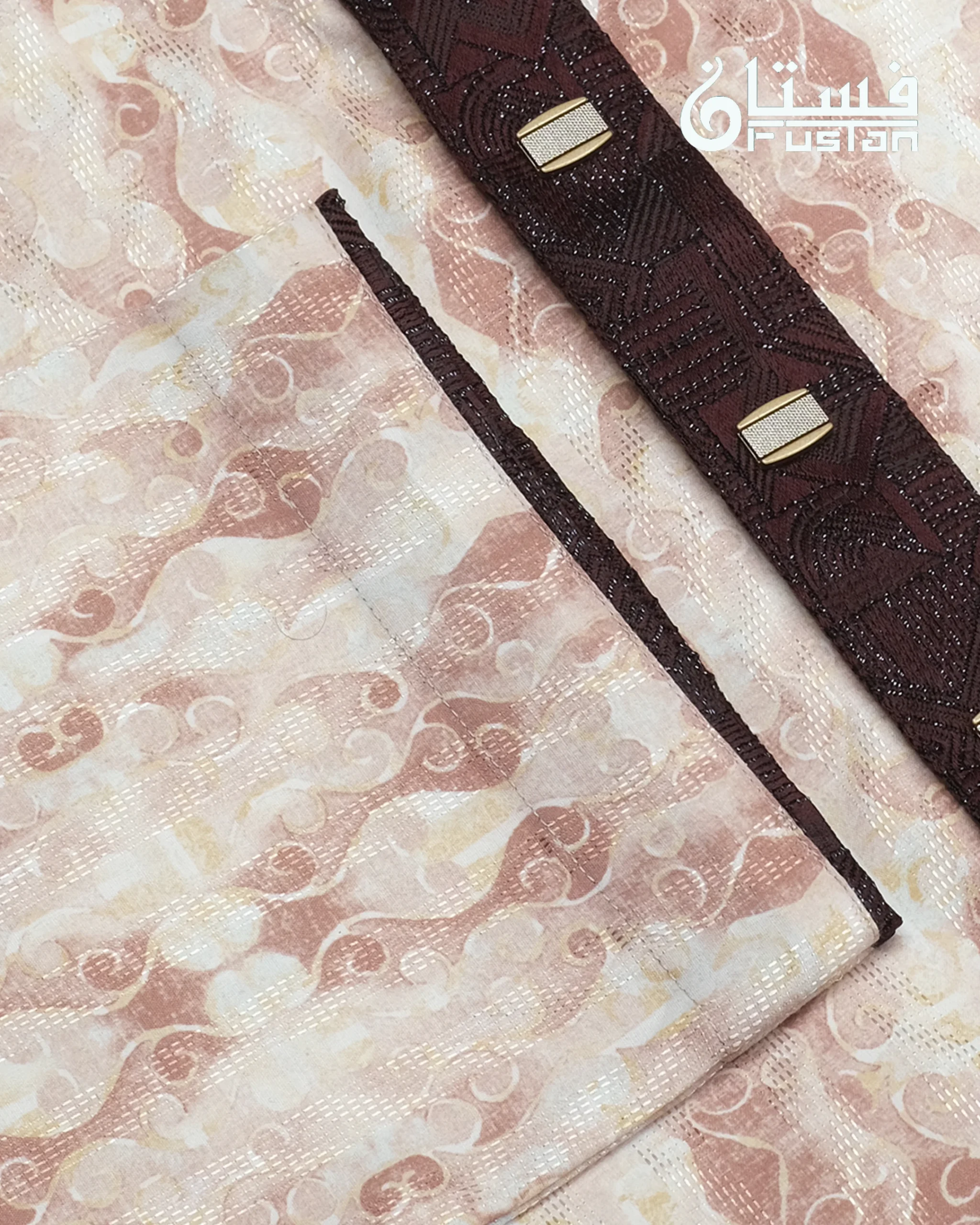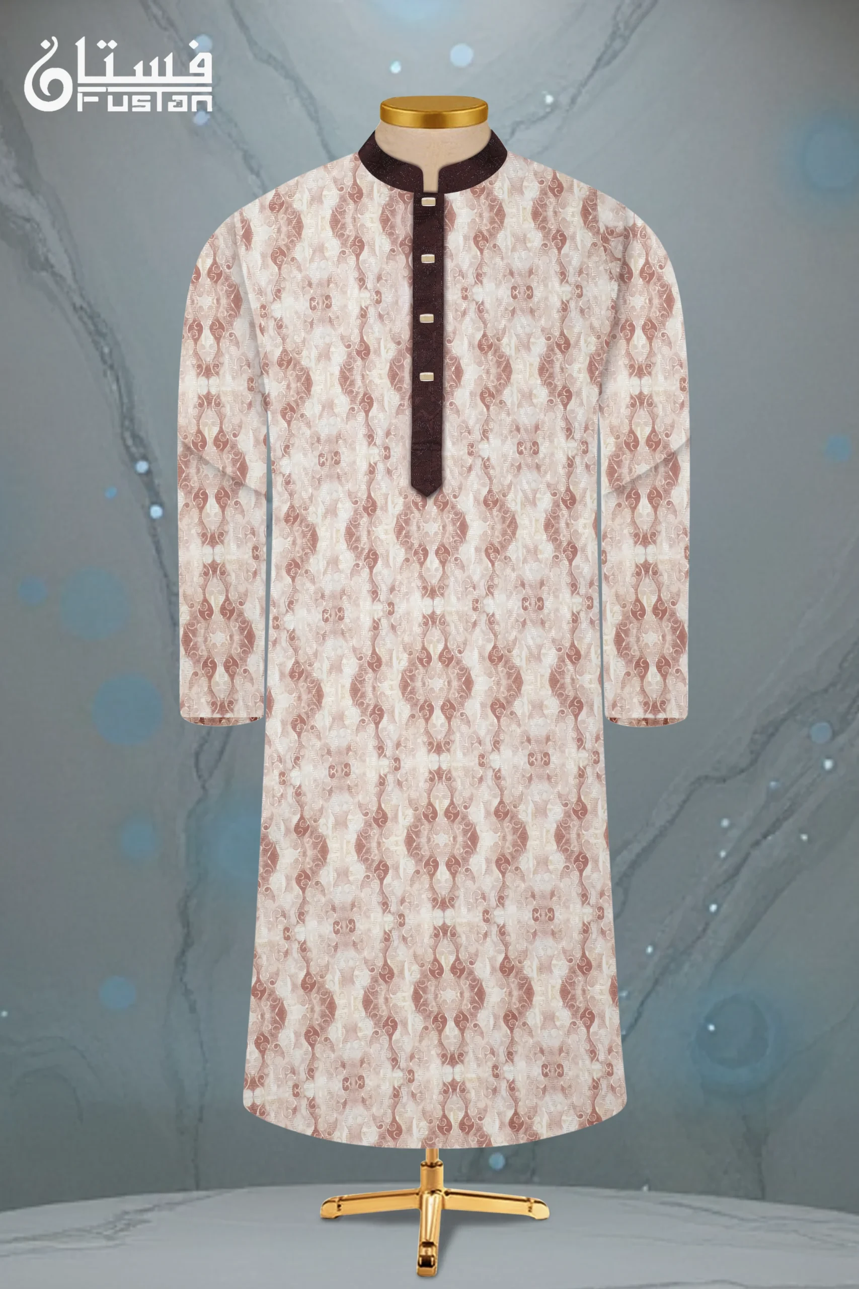 Make a serene and sophisticated statement with this masterfully crafted Designer Panjabi from FUSTAN. This garment features an innovative, all-over marble-texture print in warm mocha and soft golden-tan tones against a clean off-white base, offering a dynamic and modern visual depth. The design is elevated by a contrasting deep chocolate-brown jacquard mandarin collar and front placket featuring an intricate, multi-dimensional geometric weave. Finished with exclusive horizontal-shaped metal buttons with a shimmering metallic inlay and golden-toned frame, this Panjabi is meticulously designed for the man who values unique artisanal patterns combined with sharp, modern tailoring.