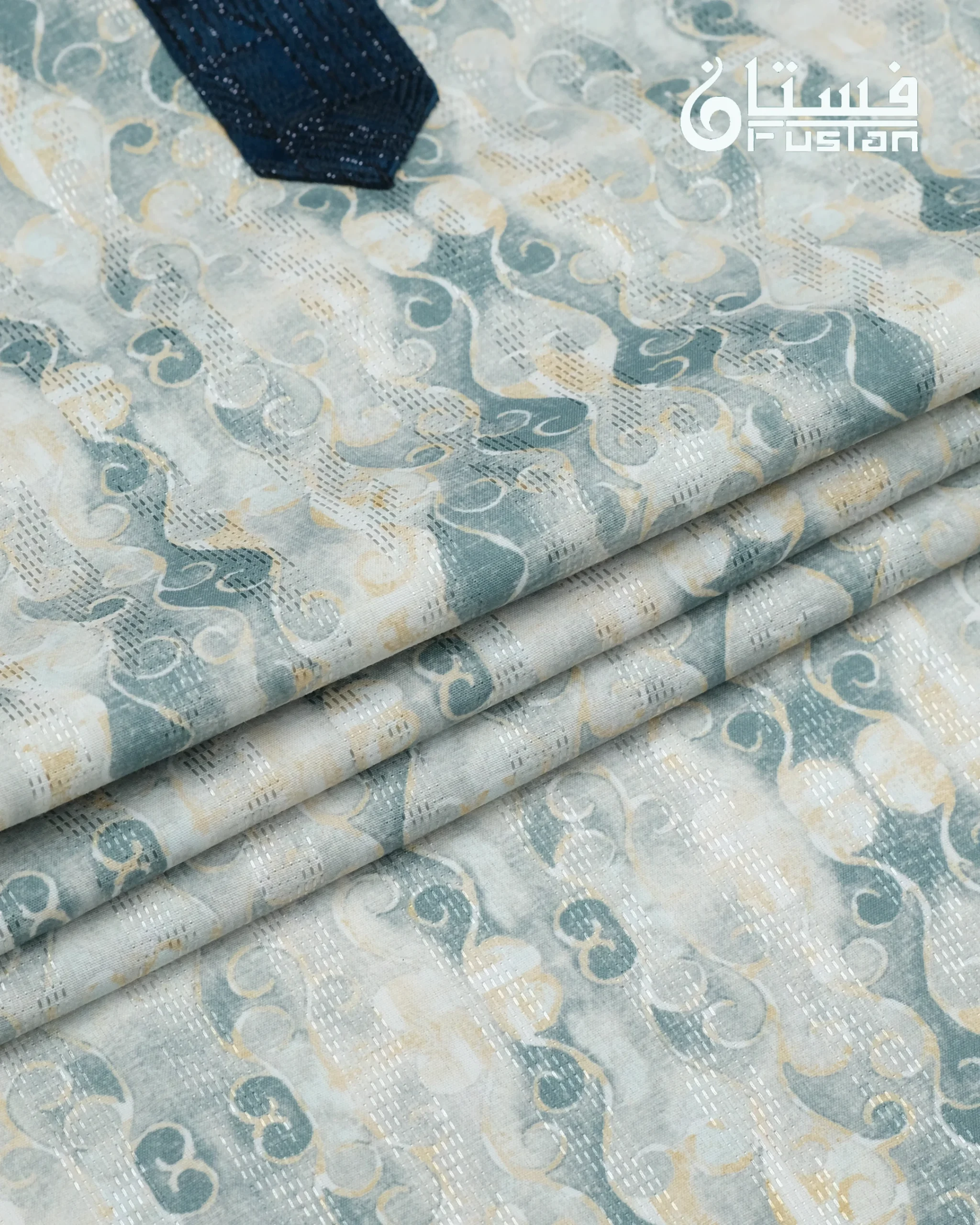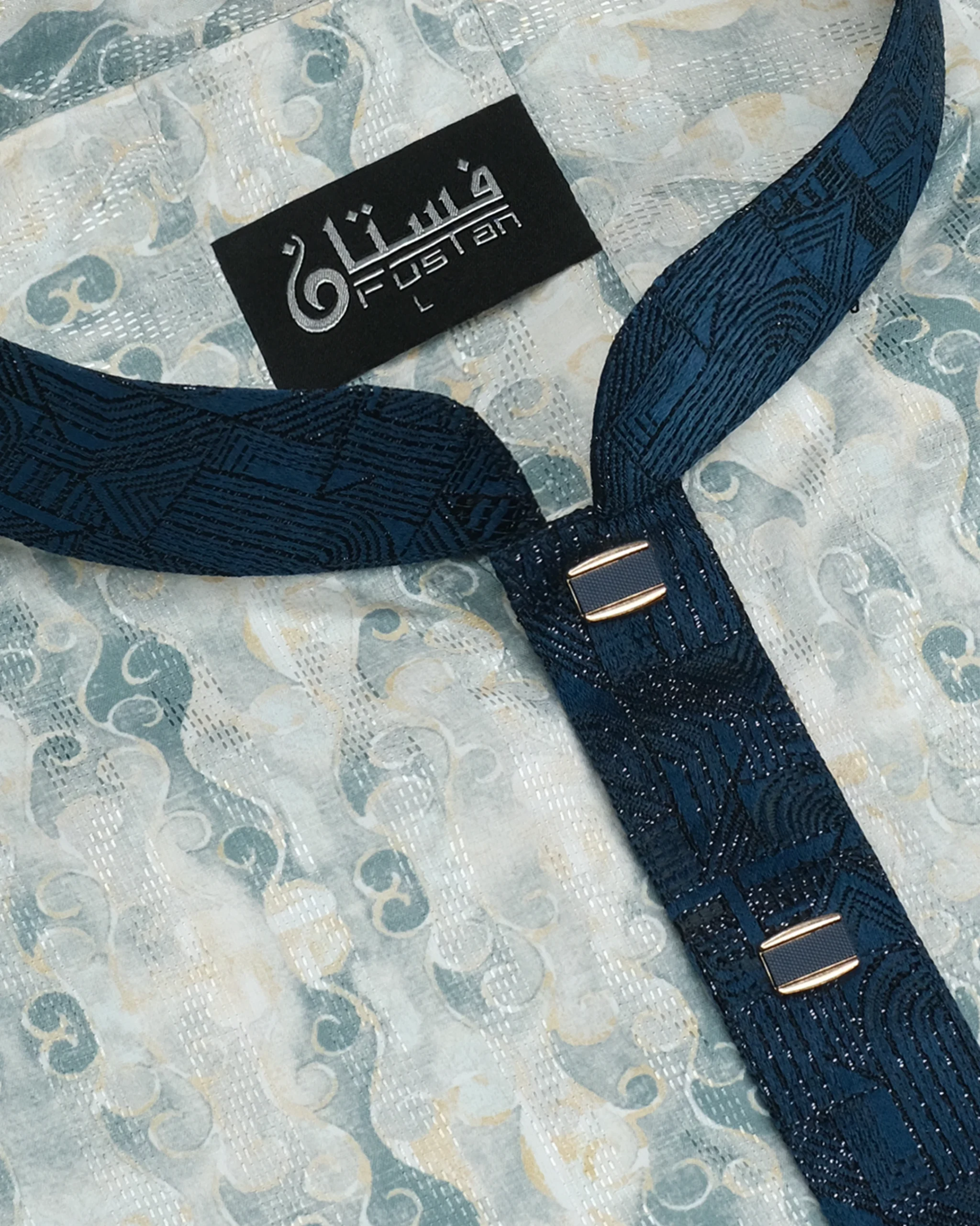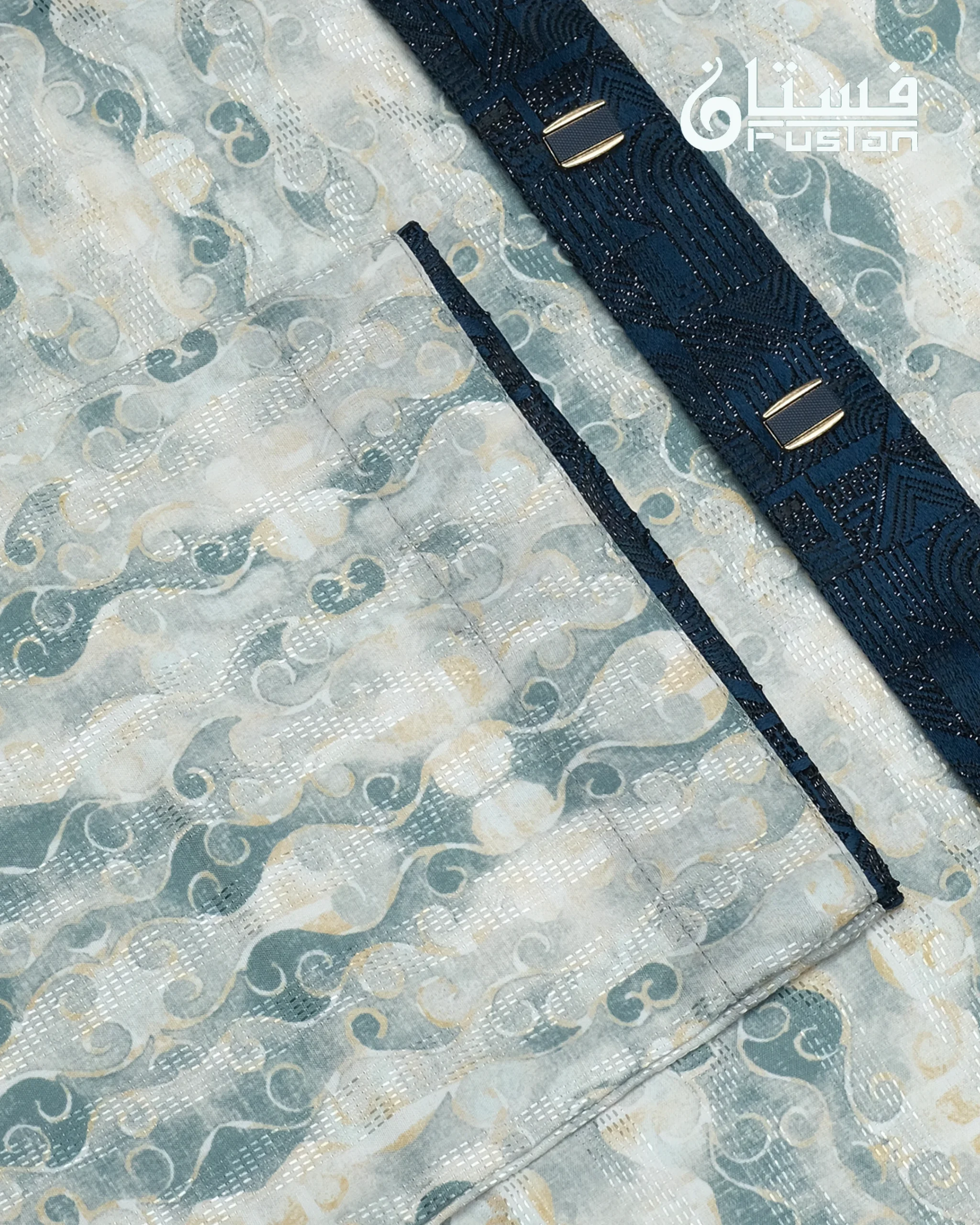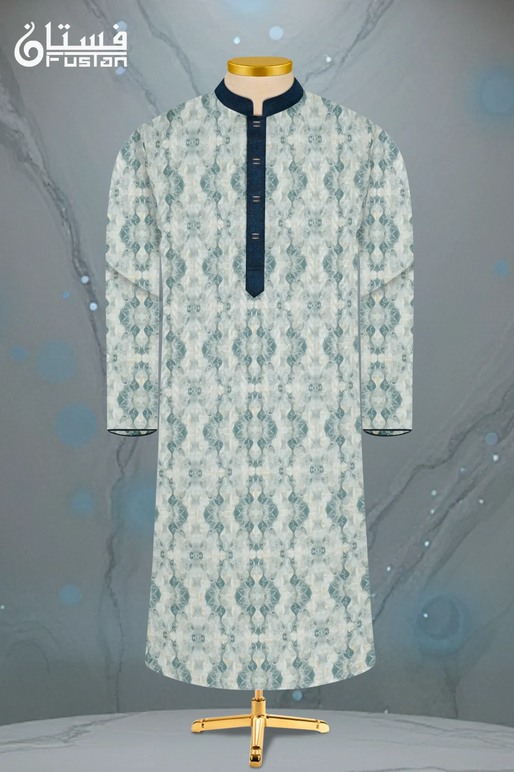 Make a serene and sophisticated statement with this masterfully crafted Designer Panjabi from FUSTAN. This garment features an innovative, all-over marble-texture print in refreshing aquamarine and soft golden-tan tones against a clean off-white base, offering a dynamic and modern visual depth. The design is elevated by a contrasting deep teal-blue jacquard mandarin collar and front placket featuring an intricate, multi-dimensional geometric weave. Finished with exclusive horizontal-shaped metal buttons with a shimmering midnight-blue inlay and golden-toned frame, this Panjabi is meticulously designed for the man who values unique artisanal patterns combined with sharp, modern tailoring.