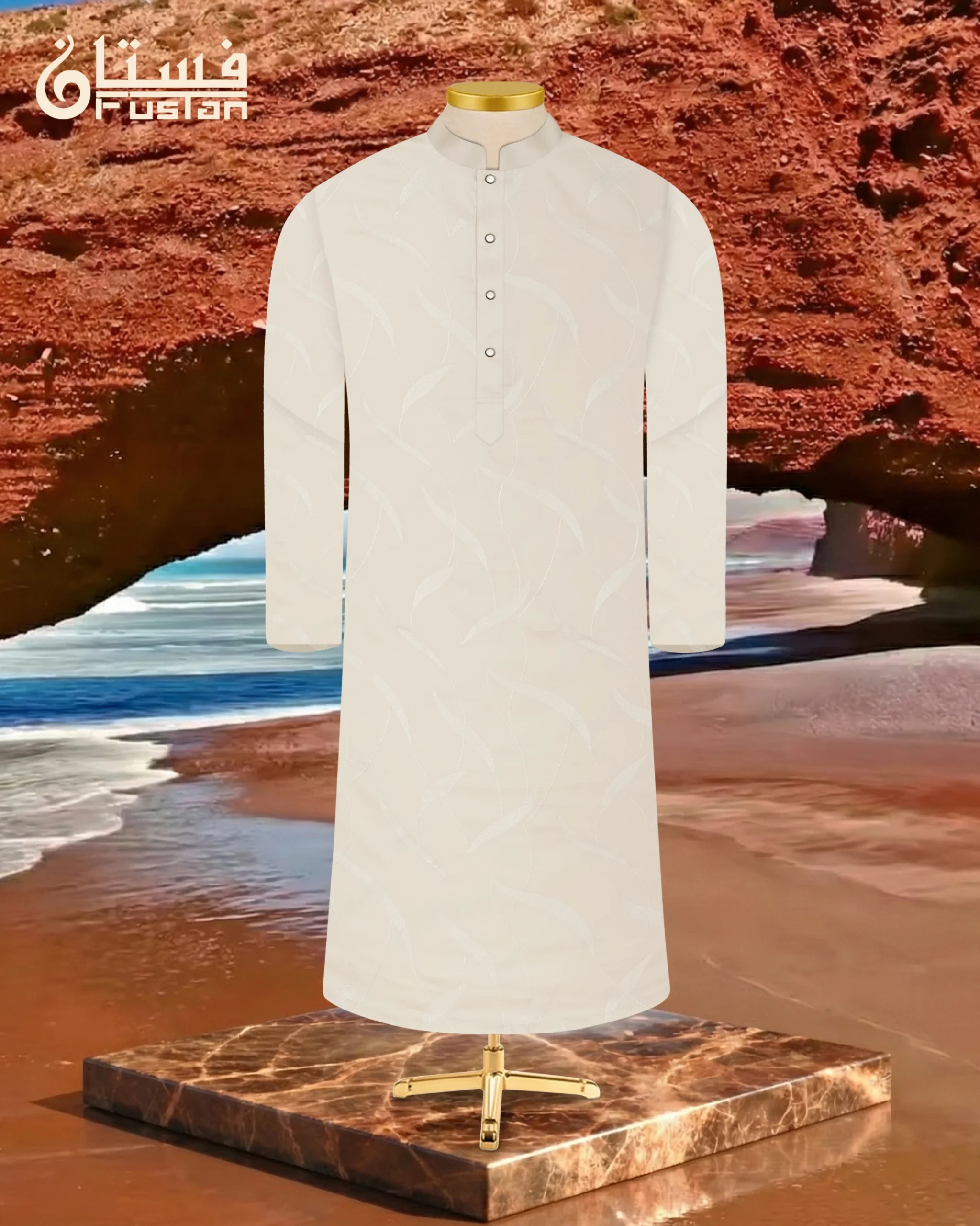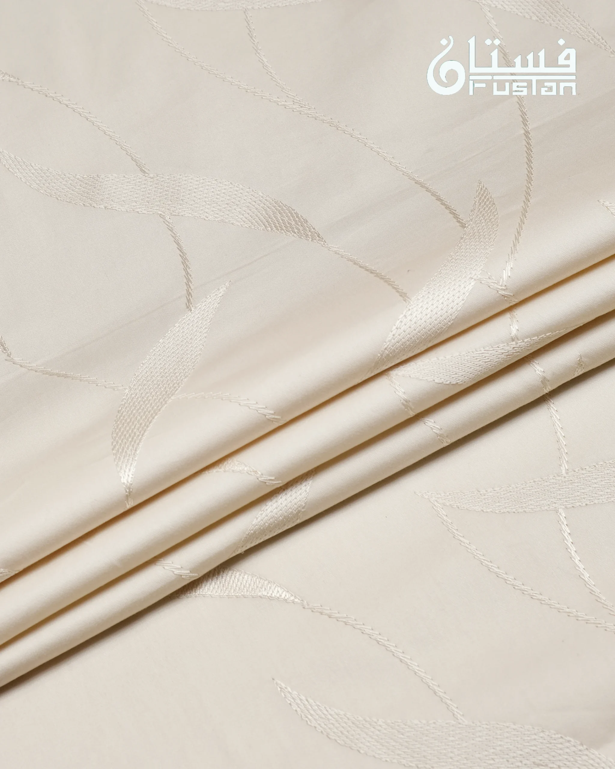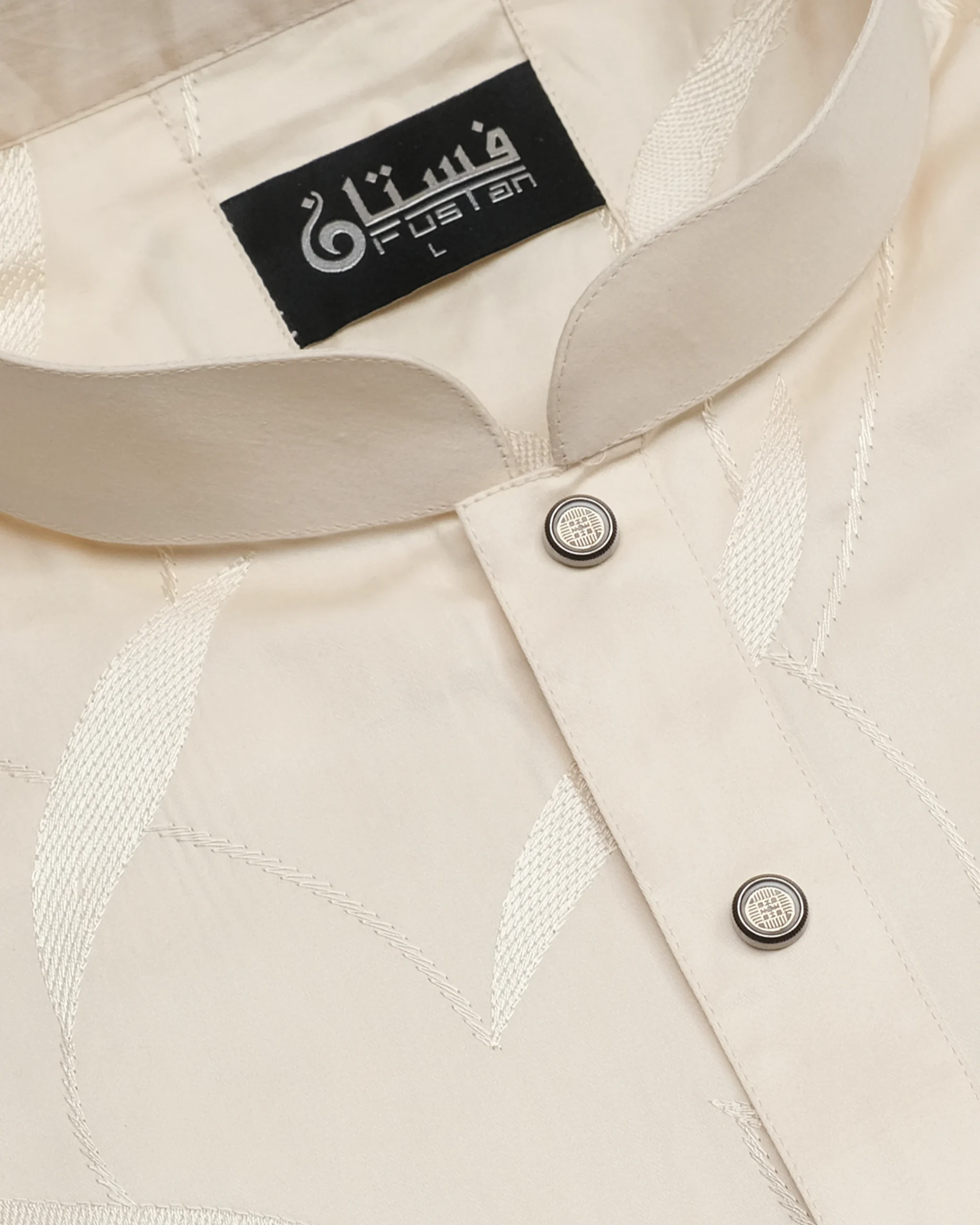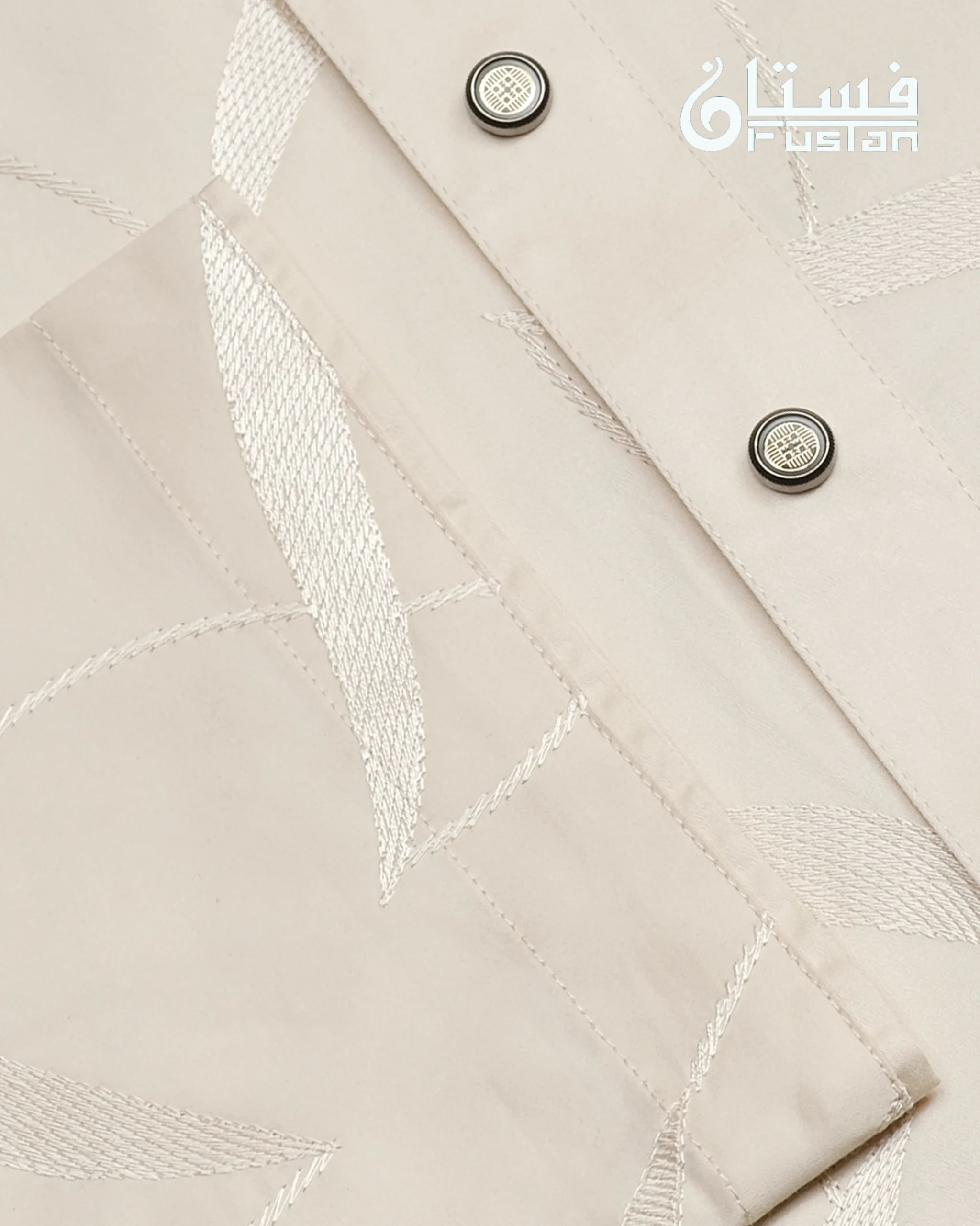 Elevate your formal traditional collection with this masterfully crafted piece from FUSTAN. This Panjabi features a sophisticated Off-White base, offering a clean and sharp silhouette designed for the modern man. The defining highlight is the high-definition Leaf Motif Embroidery cascading across the entire body and sleeves, meticulously stitched in a matching tonal thread to create a subtle and refined visual depth. Finished with exclusive circular Metal Snap Buttons featuring an intricate sunburst interior design and a dark metallic frame, this piece is a perfect balance of understated luxury and contemporary sharp tailoring.