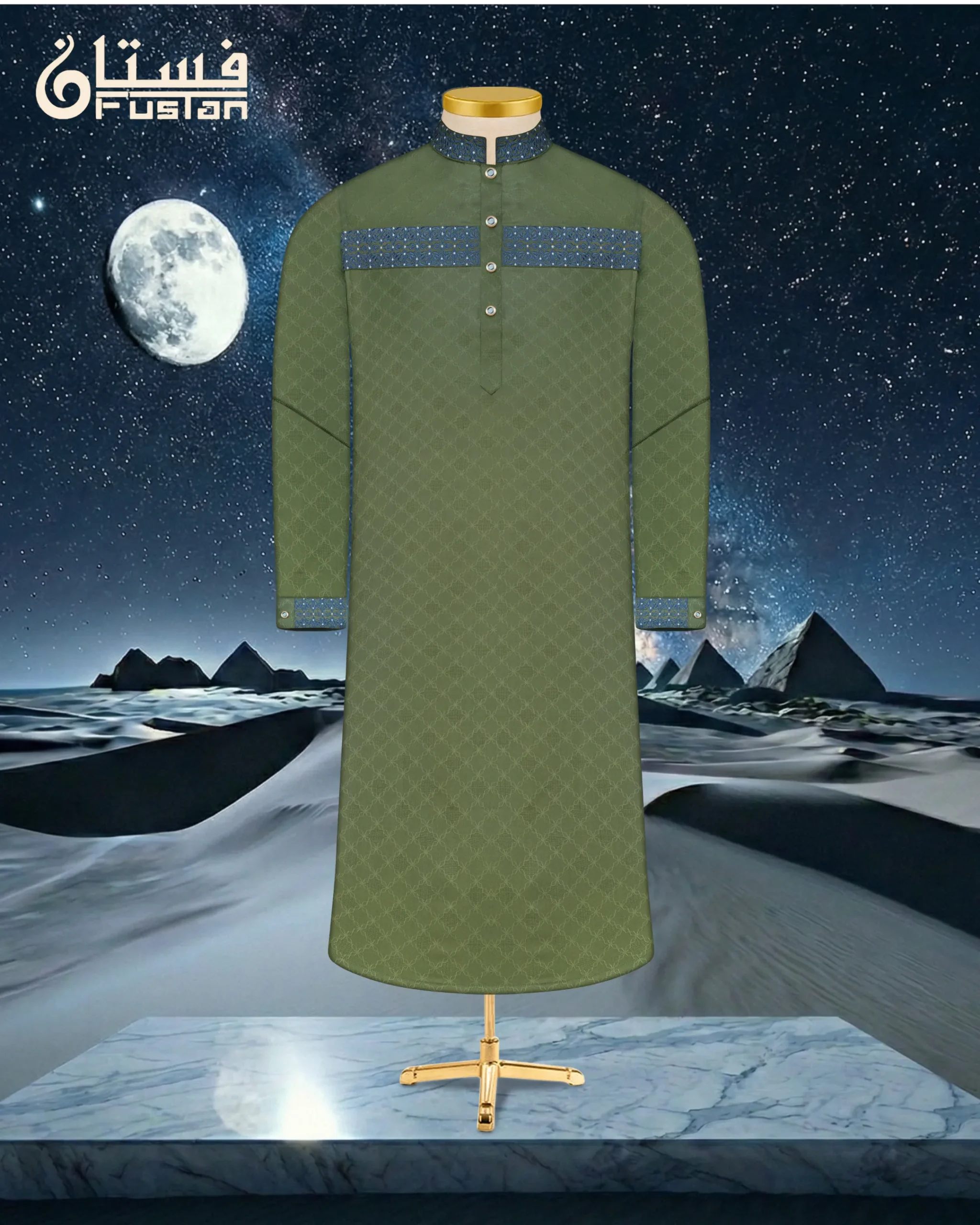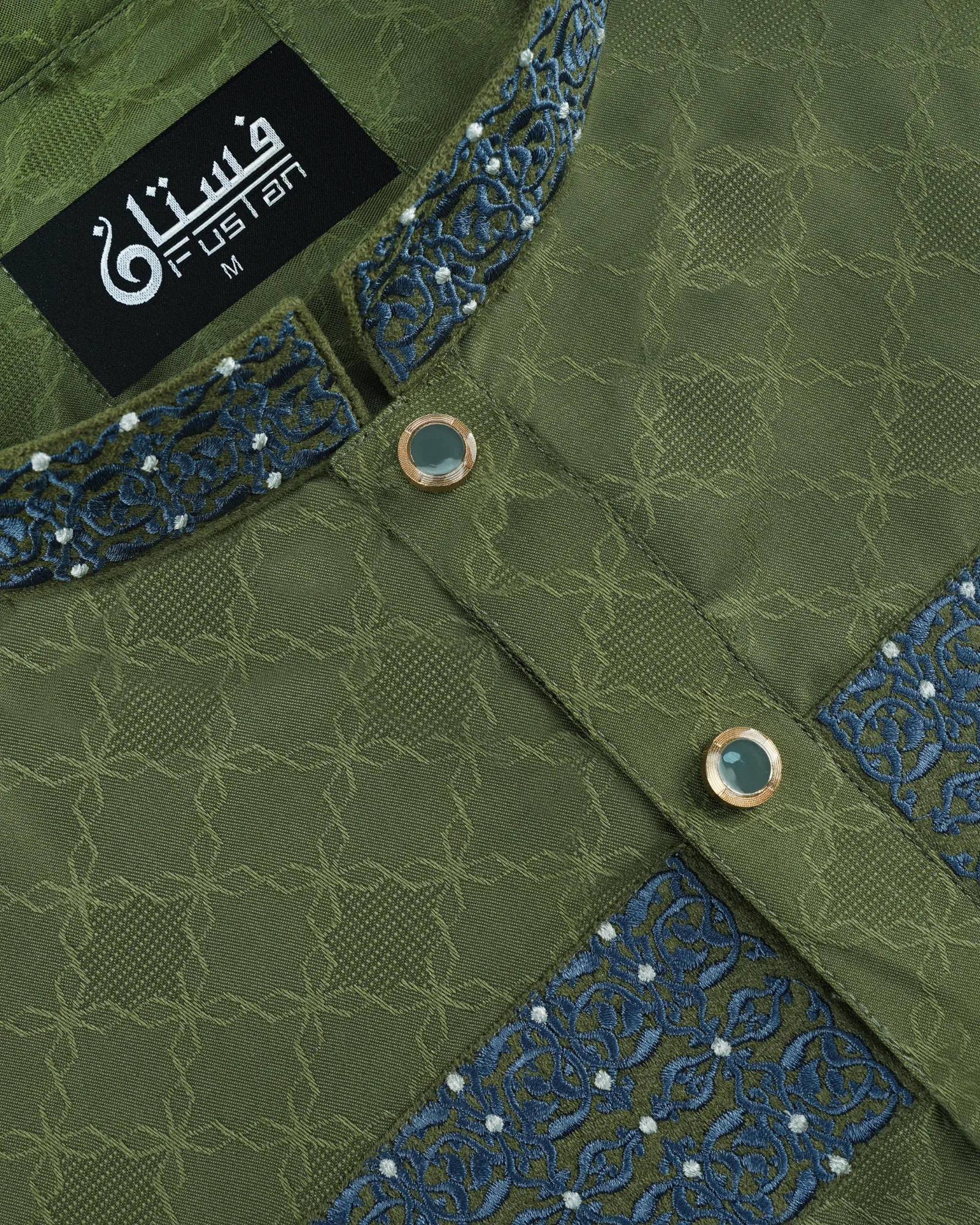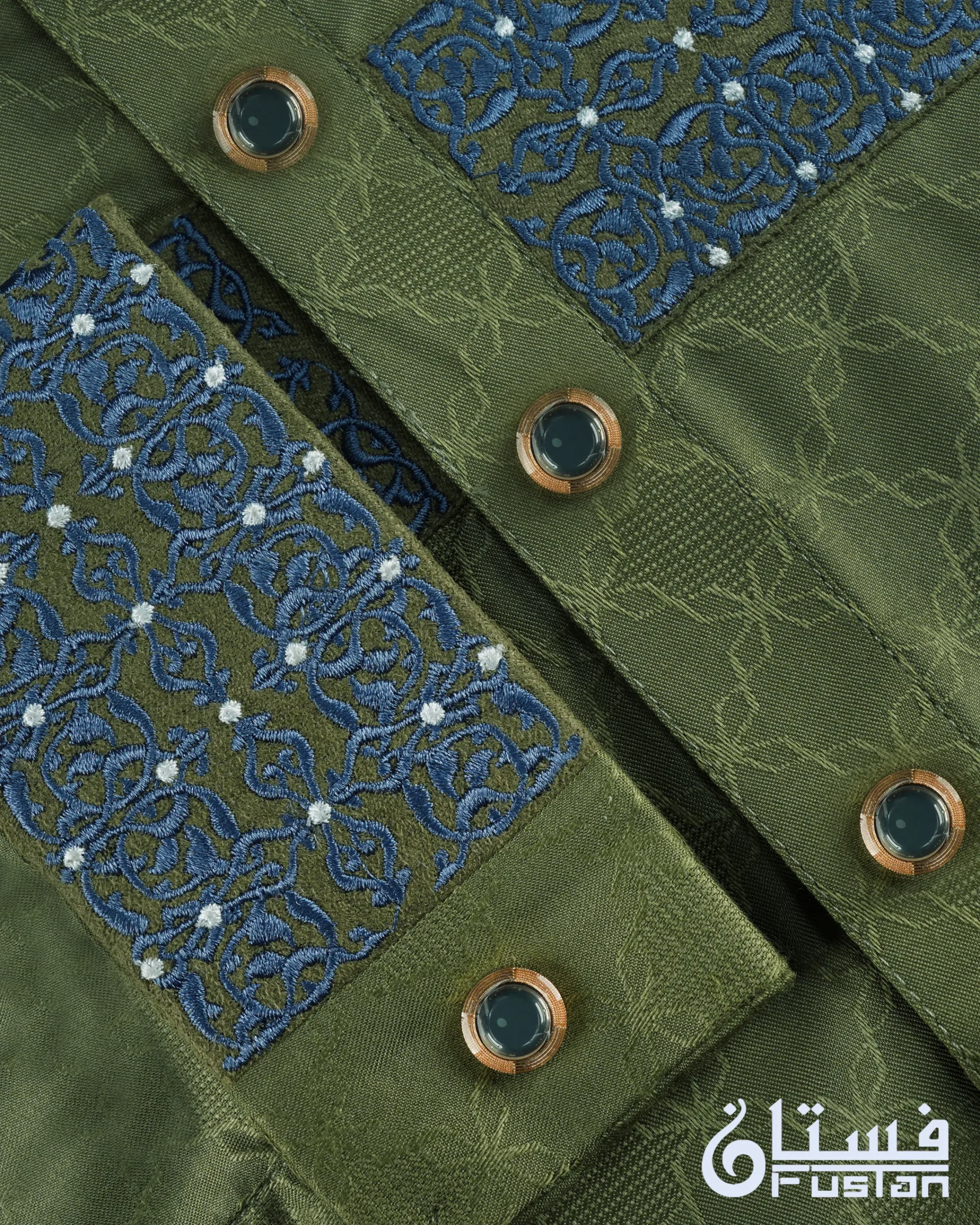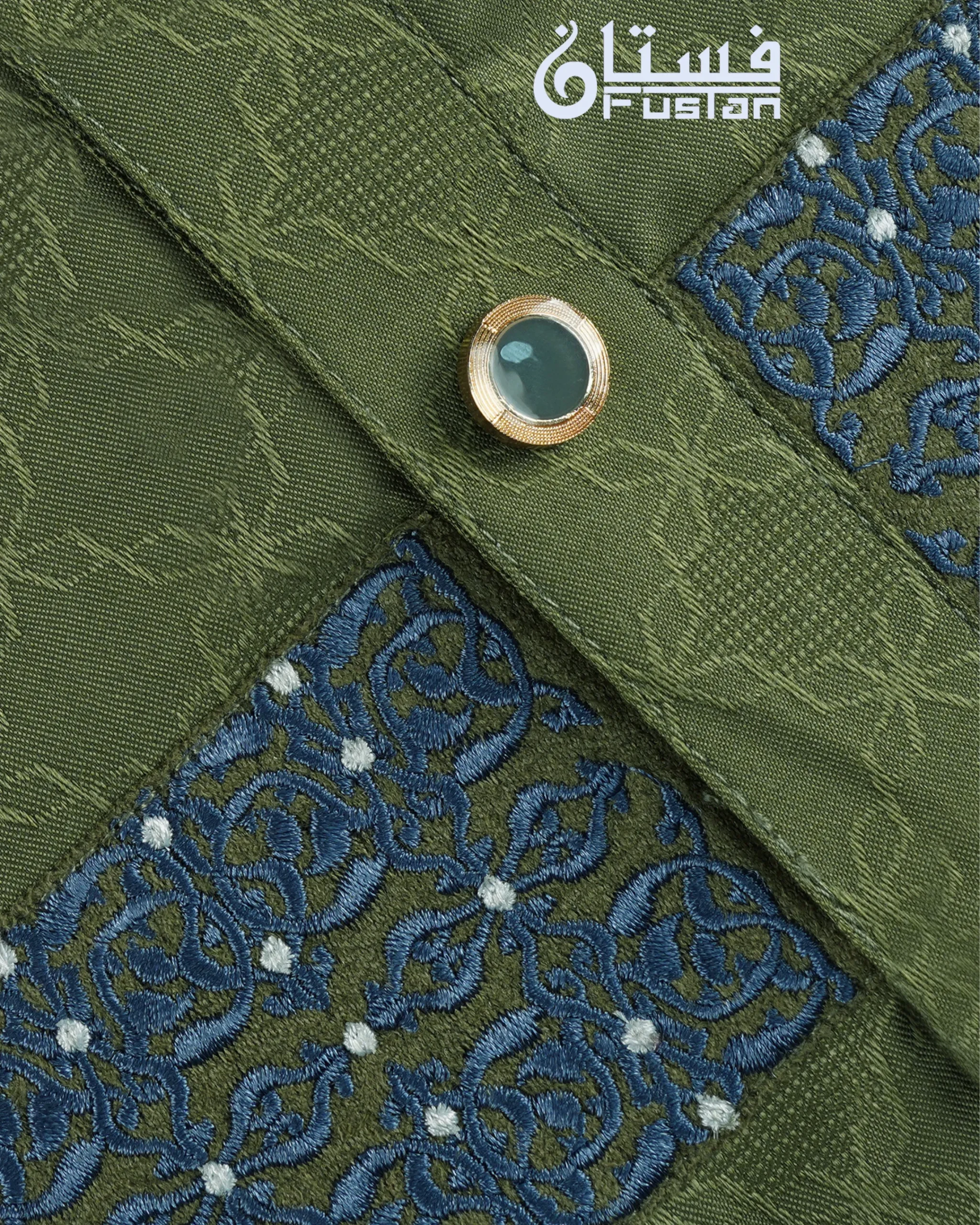 Elevate your formal traditional attire with this masterpiece of artisanal craftsmanship from Fustan. This Panjabi is set against a sophisticated Sage Green base featuring a premium self-textured jacquard weave, offering a modern and sharp silhouette. The highlight is the exquisite Embroidery work along the collar and a horizontal chest panel, featuring intricate mesh motifs meticulously detailed with deep blue and white threads. Finished with exclusive round metal buttons with a reflective teal inlay, this piece is designed for the man who seeks regal elegance and impeccable detail for grand occasions.