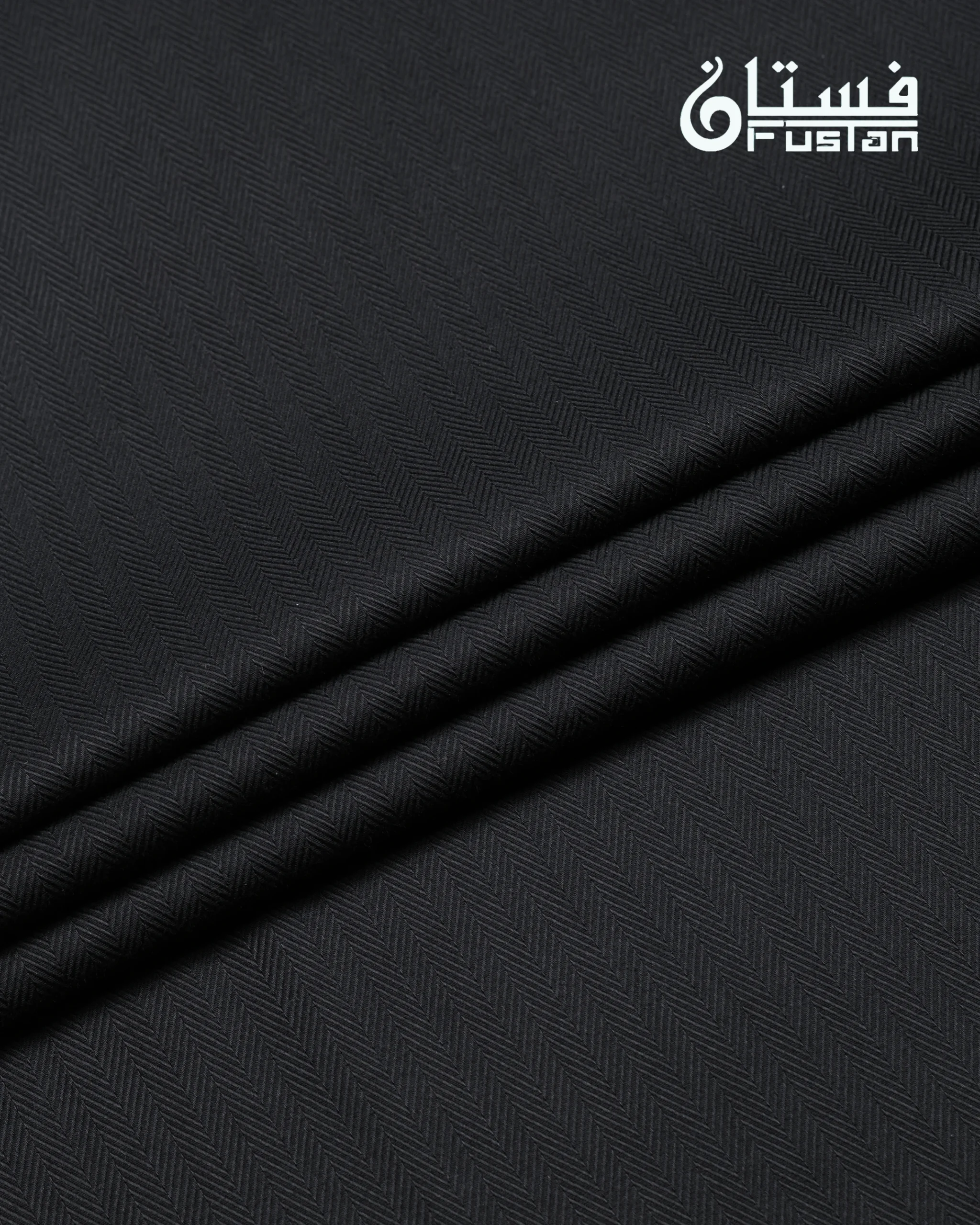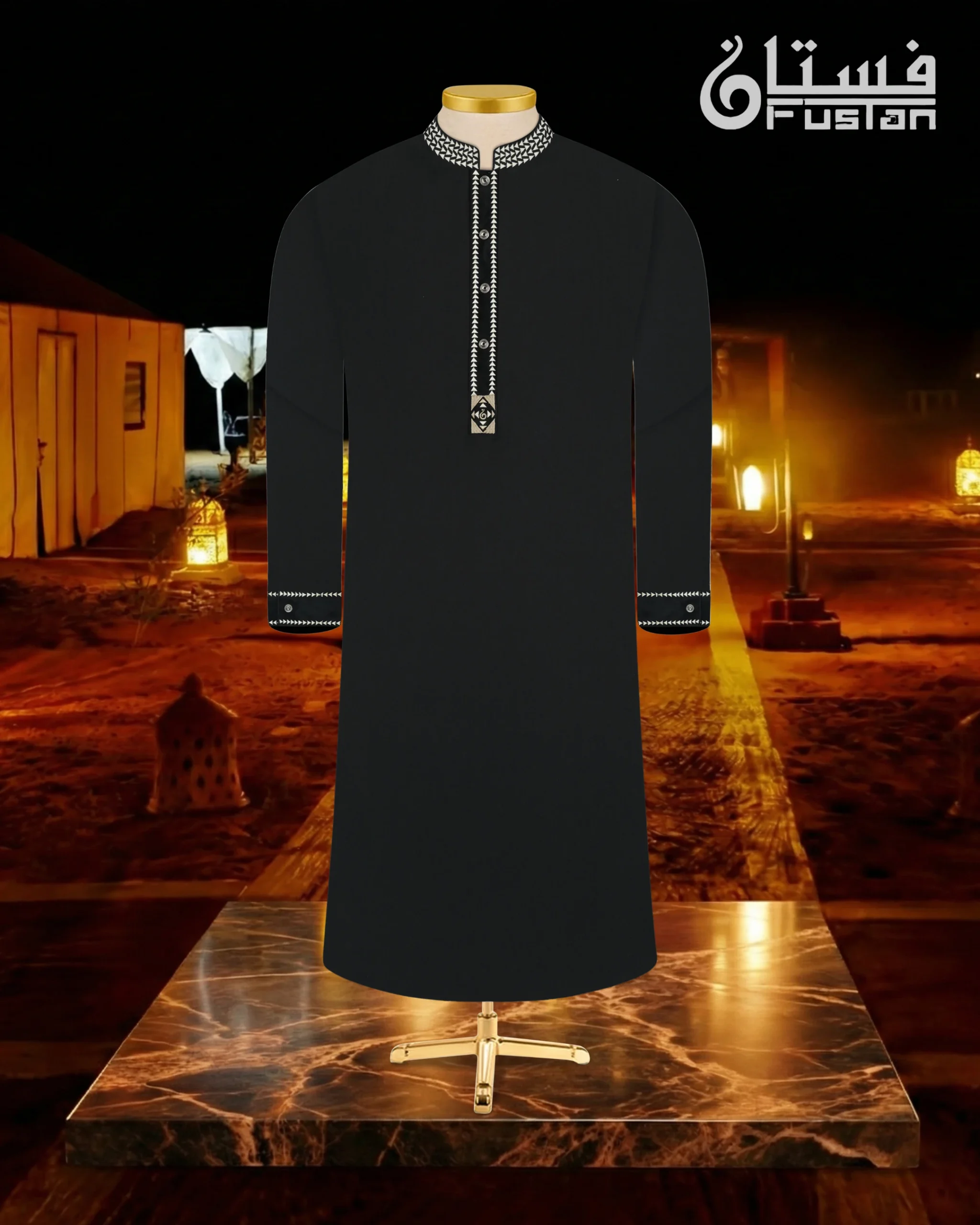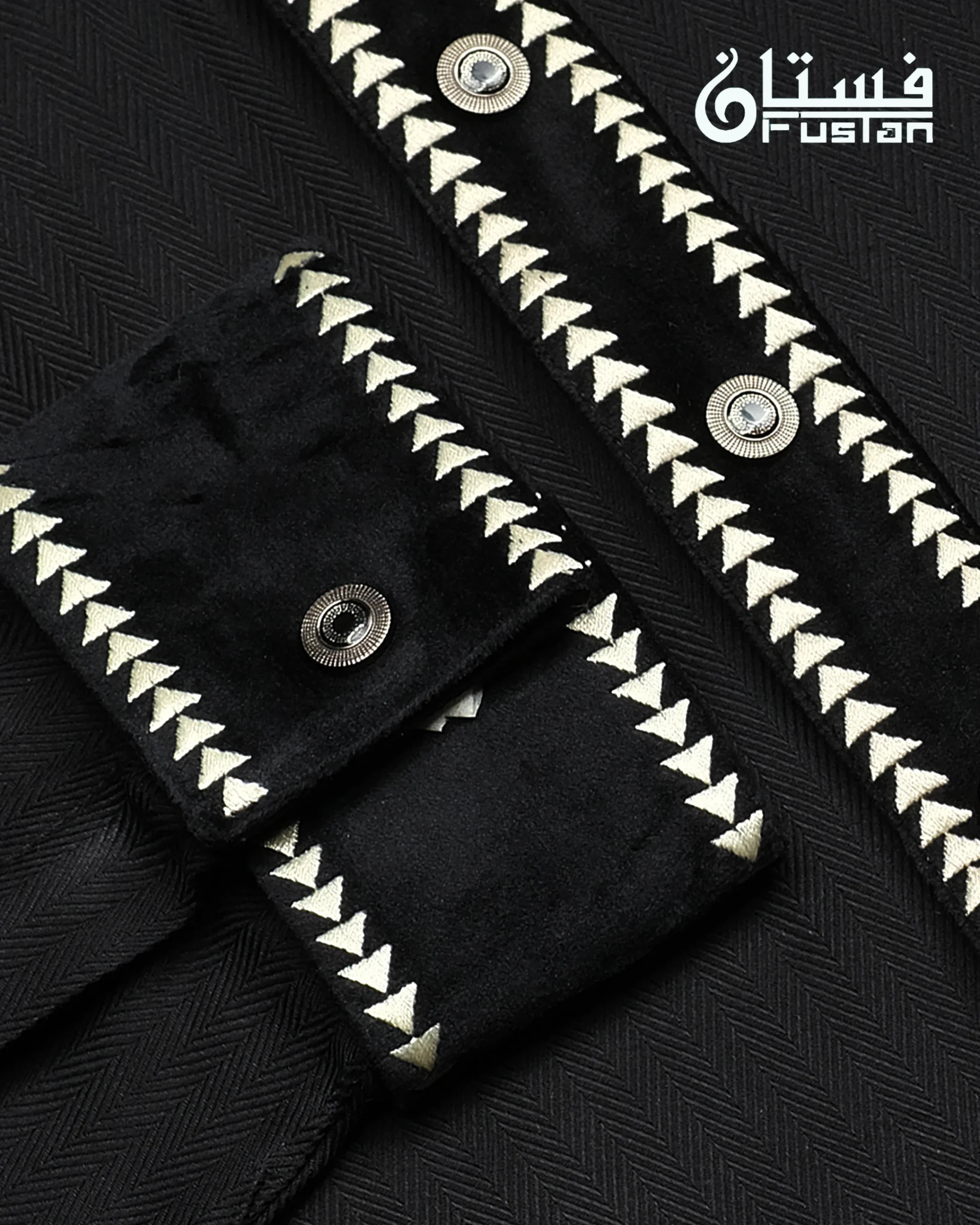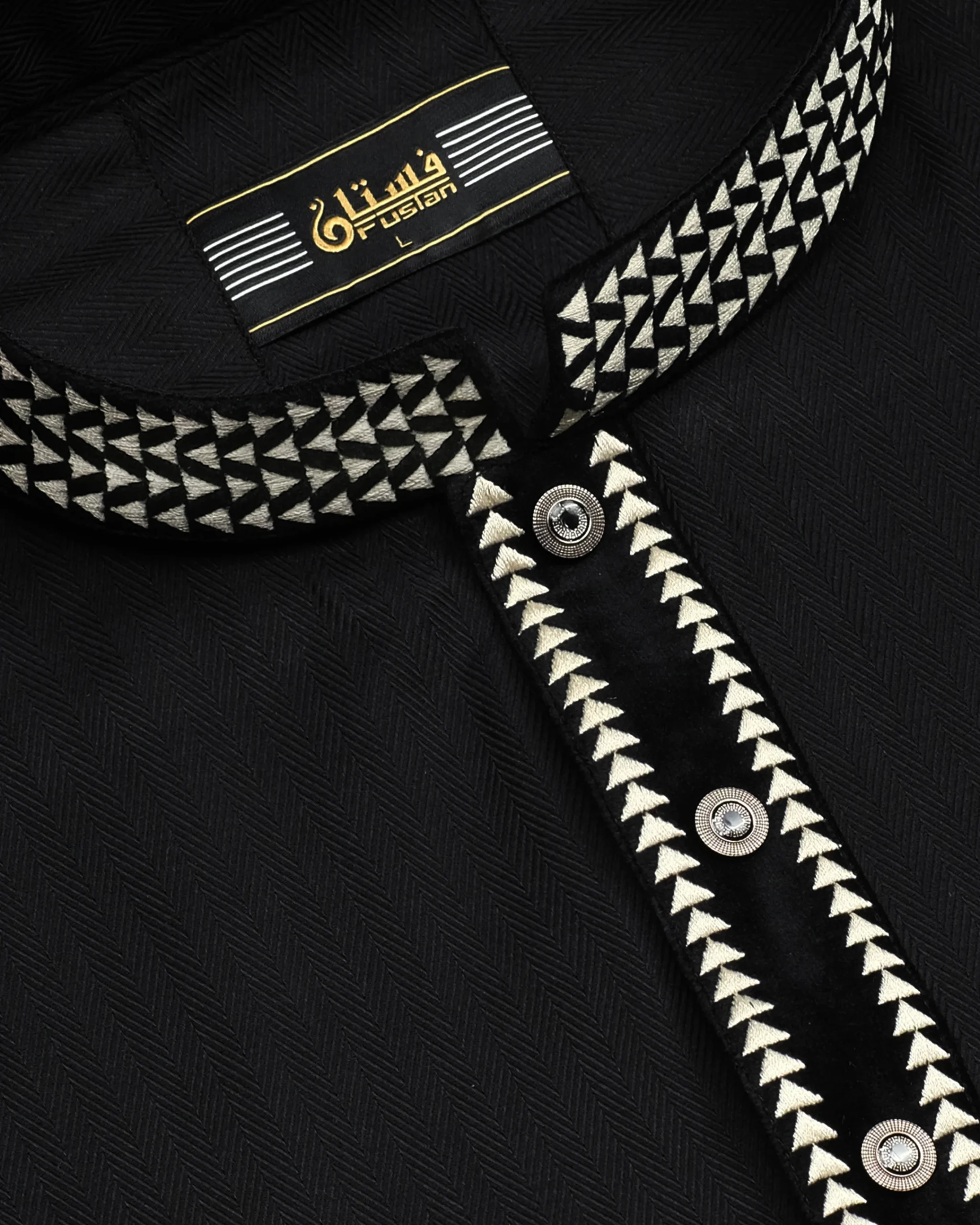Elevate your presence with this masterpiece of artisanal precision from FUSTAN. This Panjabi is set against a deep, jet-black base featuring a sophisticated all-over herringbone weave, offering a sharp and authoritative silhouette that commands respect. The defining highlight is the opulent hand-embroidered artistry featured across the prominent mandarin collar, front placket, and sleeve cuffs. Showcasing a dense, interwoven geometric “triangle” pattern in a refined silver-white thread, this intricate work provides a luxurious, multi-dimensional contrast against the dark velvet-textured panels. Finished with exclusive circular silver ornamental buttons featuring a reflective stone inlay, this Panjabi is meticulously designed for the man who values royal elegance and superior craftsmanship.