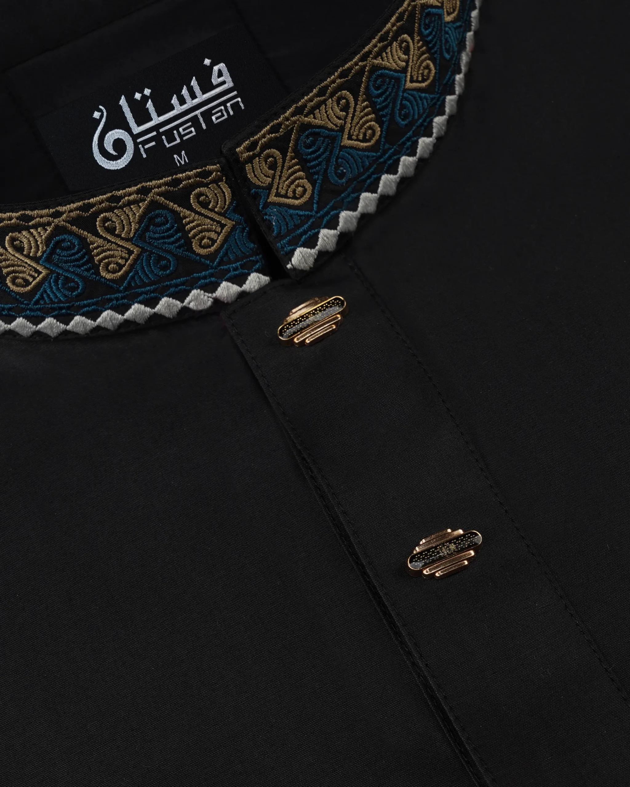 Elevate your presence with this masterpiece of craftsmanship from Fustan. This Panjabi is set against a deep obsidian black base, offering a powerful and timeless silhouette. The highlight of this piece is the intricate, high-density swirl embroidery adorning the collar and cuffs, featuring a sophisticated palette of royal blue, charcoal, and antique gold threads. Accented with premium horizontal bar-style metal buttons with a textured black and gold-flecked inlay, this Panjabi is designed for the modern man who values prestige and impeccable attention to detail.
