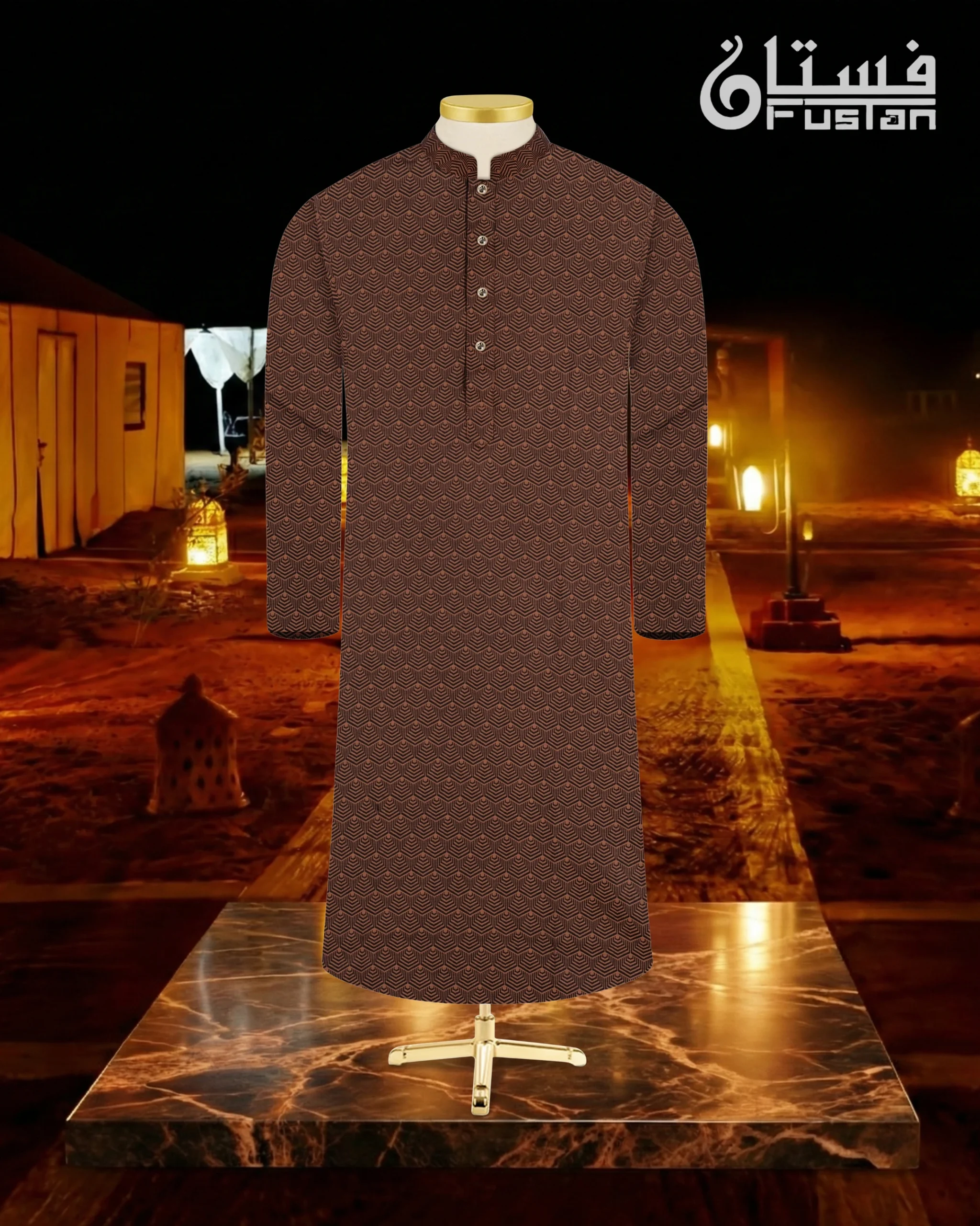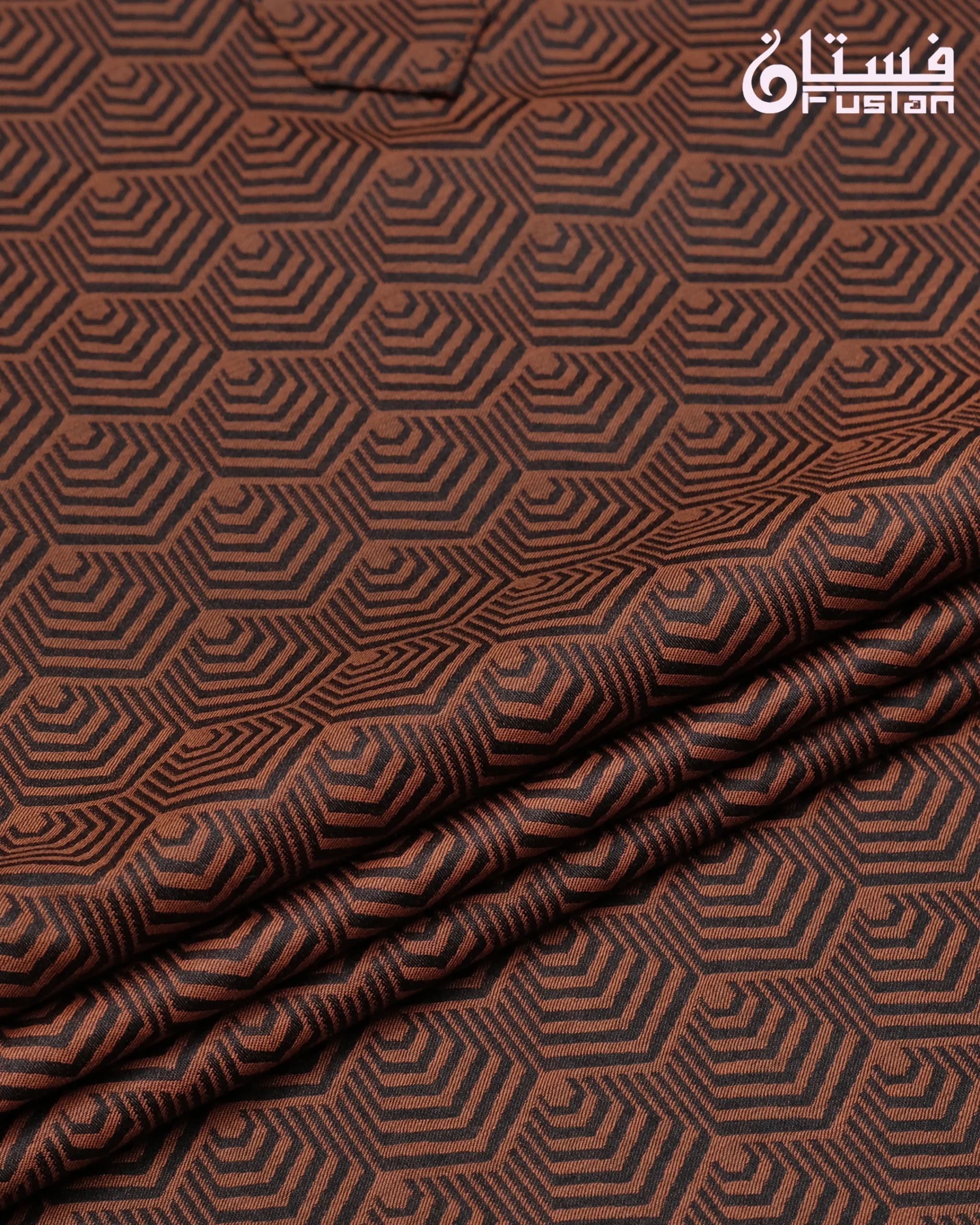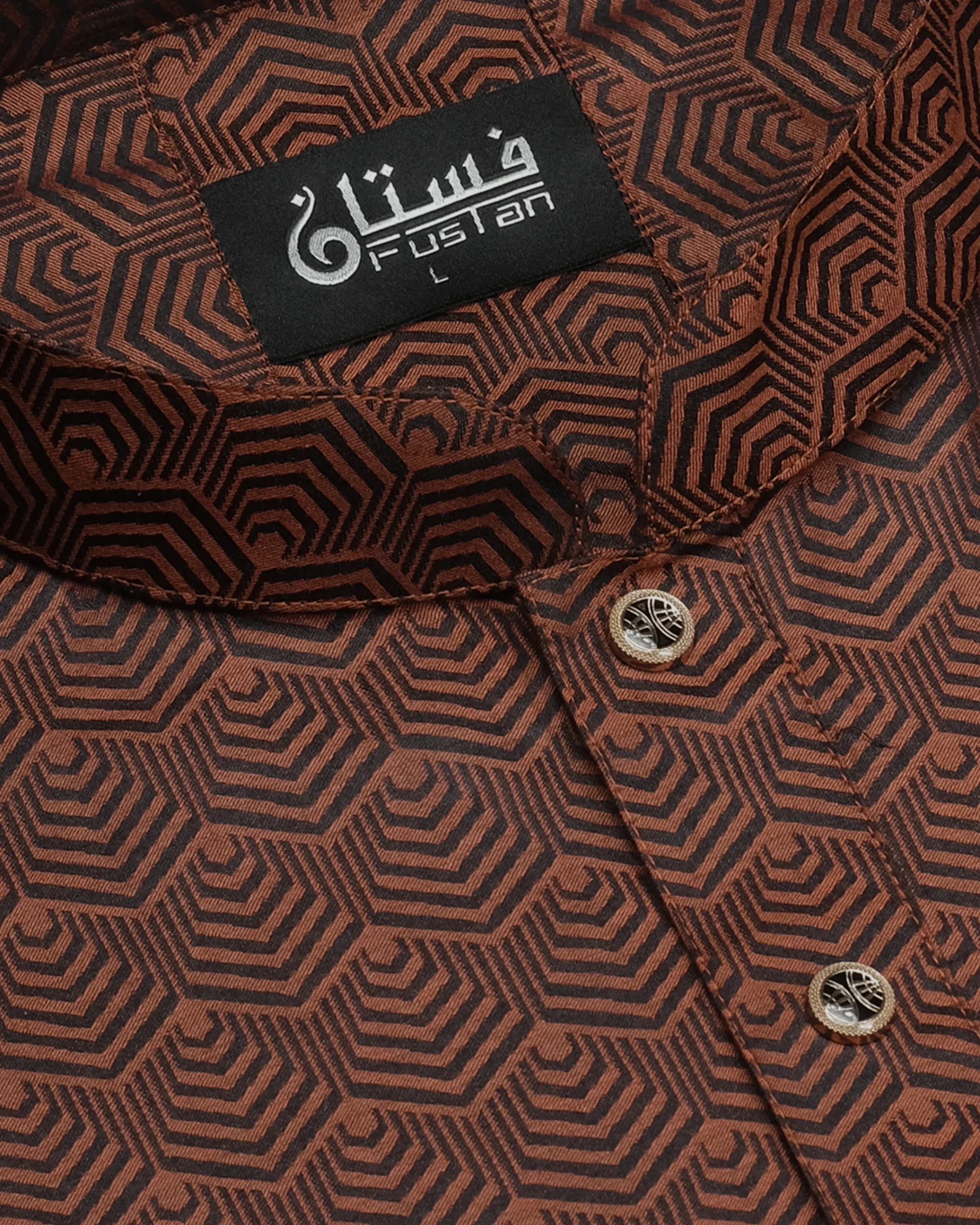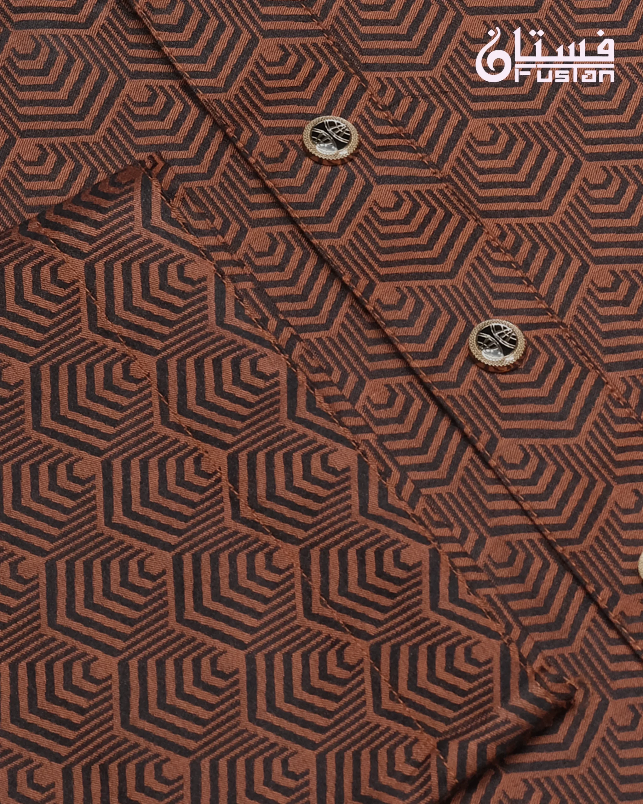 Make a bold, contemporary statement with this uniquely designed Brown Panjabi from Fustan. This garment features an innovative, all-over hexagonal geometric pattern that flows seamlessly across the entire piece. Unlike other designs, this edition features a matching monochrome aesthetic where the mandarin collar, placket, and body utilize the exact same patterned fabric for a unified, high-fashion look. Finished with premium circular metal snap buttons with a decorative sunburst center, this Panjabi is meticulously crafted for the man who values modern edge combined with artisanal detail.