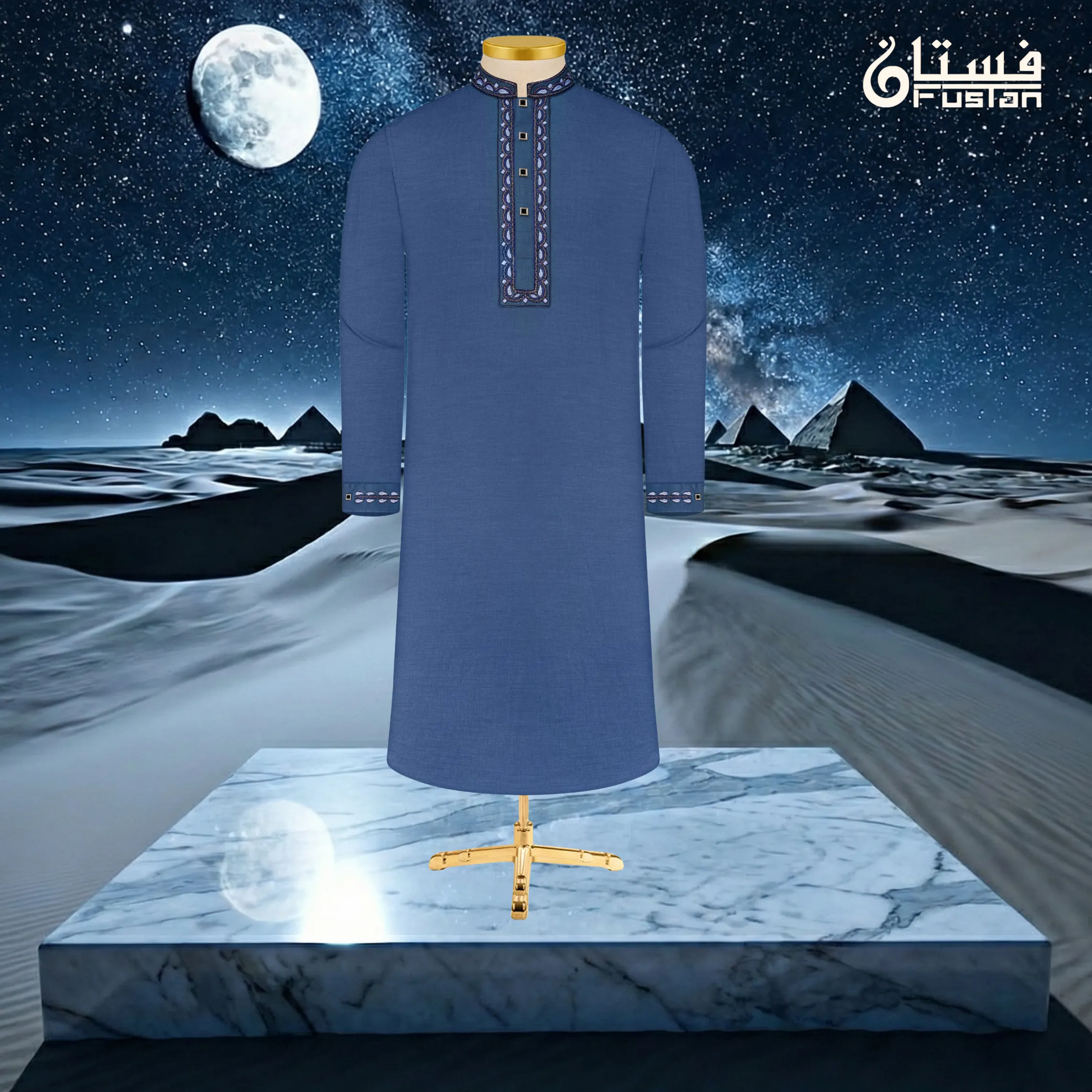 Elevate your formal traditional attire with this masterpiece of artisanal craftsmanship from Fustan. This Panjabi is set against a sophisticated Royal Blue base featuring a refined textured weave, offering a sharp and authoritative silhouette. The highlight is the exquisite Zardozi Handwork along the mandarin collar and front placket, featuring intricate floral and leaf motifs meticulously handcrafted with light blue threads and shimmering stones. Finished with exclusive square-shaped black stone ornamental buttons with a silver-toned border, this piece is designed for the man who seeks regal elegance and impeccable detail for grand occasions.